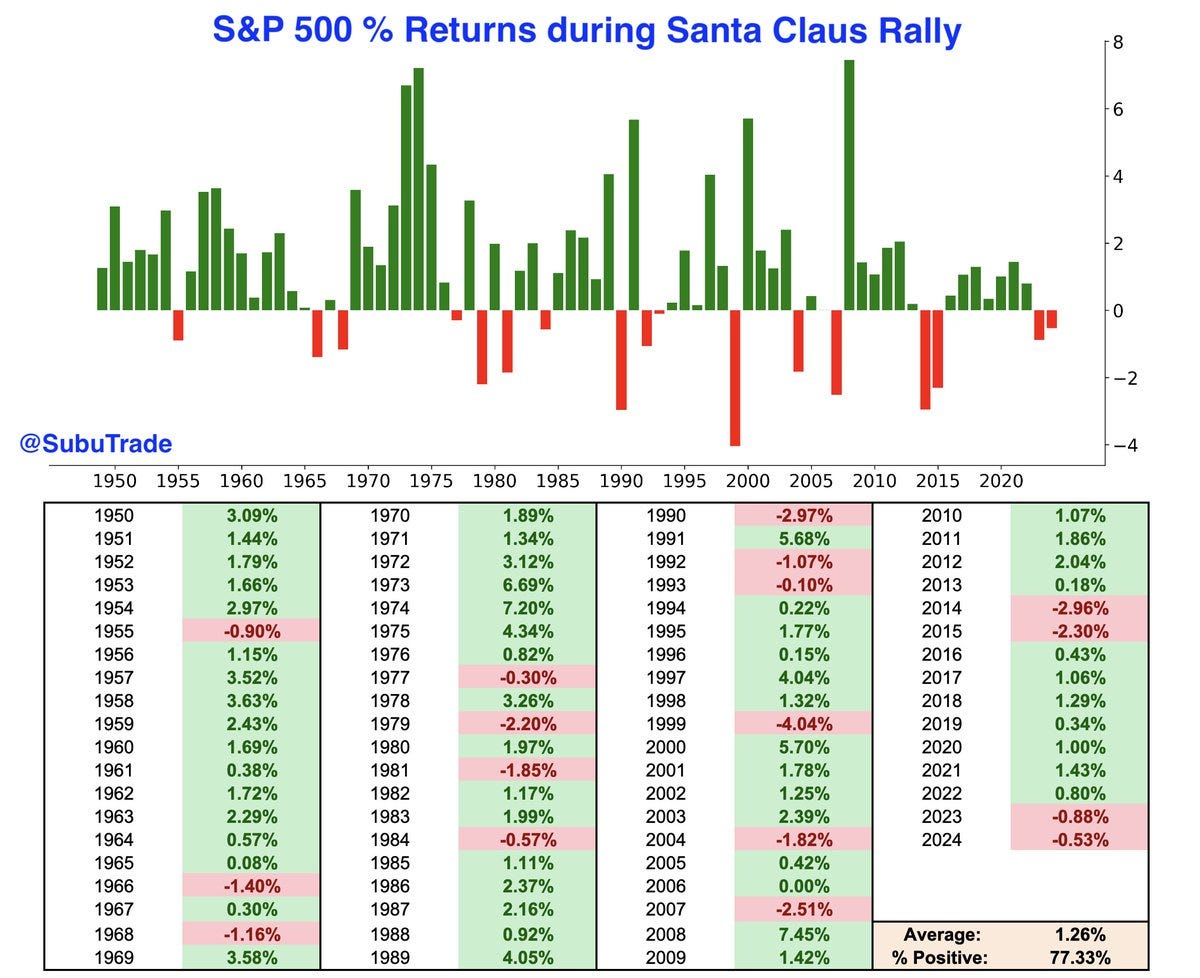 The stock market also remains within a favorable seasonal period, including the Santa Claus rally over the near-term. That period marks the final five trading sessions of the year along with the first two days of the New Year. Going back to 1950, the Santa Claus rally has delivered a positive return 77% of the time with an average gain of 1.26% for the S&P 500. It’s notable that the last two years have seen negative returns during the period, and that there’s never been a stretch of three negative years during the Santa Claus rally period (chart below).