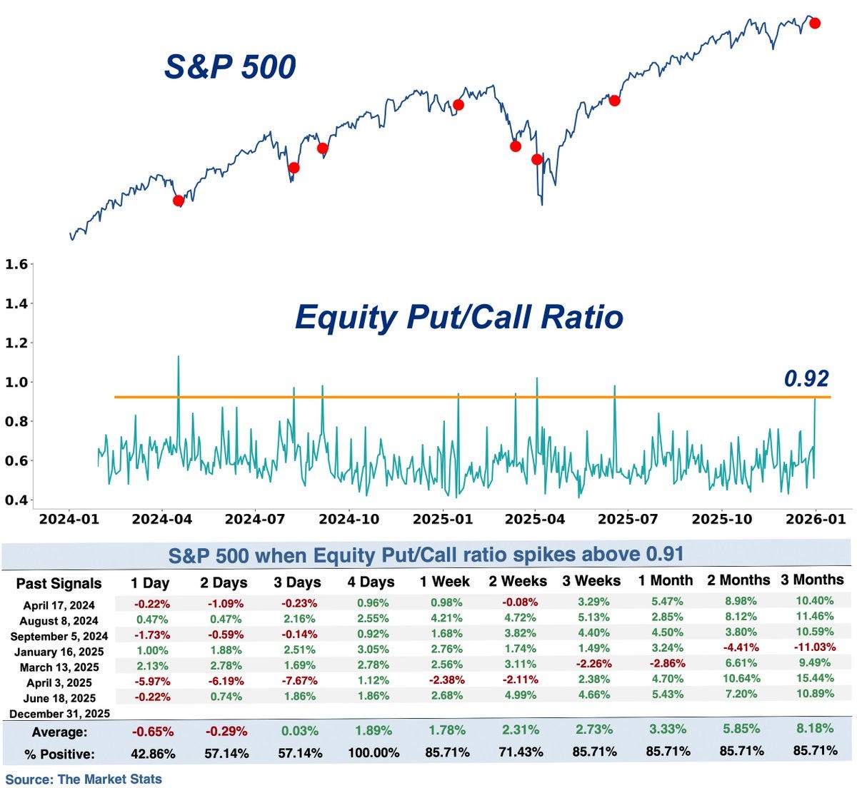 The S&P 500 closed out the final trading sessions of 2025 on a weak note. The index has lost 1.3% over the past week, which coincides with a period marking the historically strong Santa Claus rally. While there’s still two trading sessions left to complete the Santa Claus period, the S&P could potentially finish the stretch with a loss for the third consecutive year in a row, which has never happened before. If anything is going to save the Santa Claus rally, it could be a short-term spike in bearish option positioning. The ratio of put volumes relative to call volumes spiked on the last trading day of the year to .92 (chart below). That level shows bets on downside reaching an extreme, which historically has seen the S&P deliver strong gains on average in the days ahead.