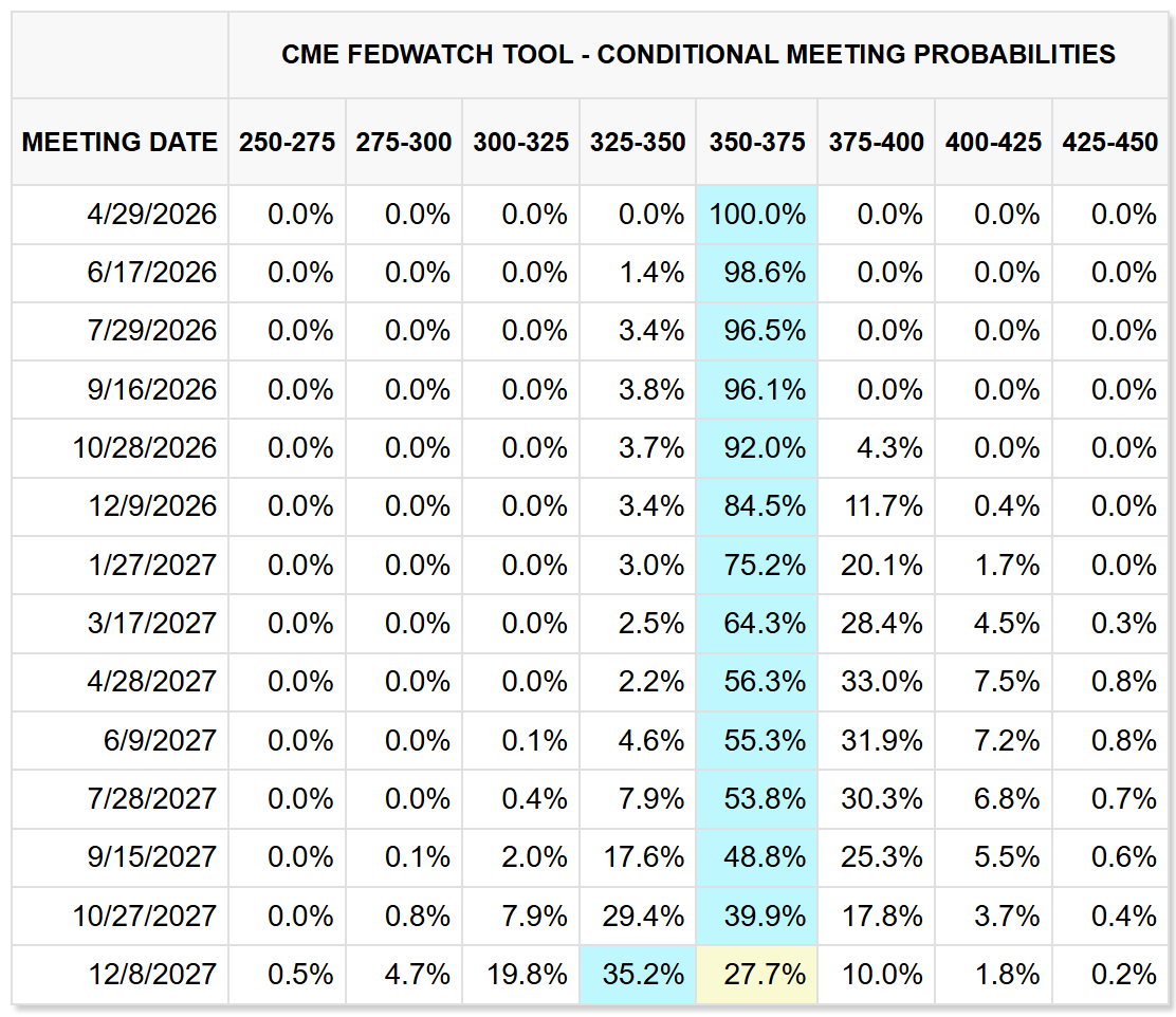 The S&P 500 is hovering just below record highs as massive catalysts get underway. This week features the final Federal Reserve rate-setting meeting that will be chaired by Jerome Powell, who looks set to be replaced by Kevin Warsh following a key procedural vote in the Senate. While the Fed held rates steady as widely expected, the meeting statement saw the most dissenters since 1992 with most against language indicating an easing bias. The central bank is becoming more divided on the appropriate path of monetary policy, and Warsh will take control in the face of rising inflation pressures from commodities. Core measures of inflation that exclude food and energy prices haven’t been below the Fed’s 2% target in over five years. Market implied odds don’t show any movement on the fed funds rate until the end of 2027 (chart below).