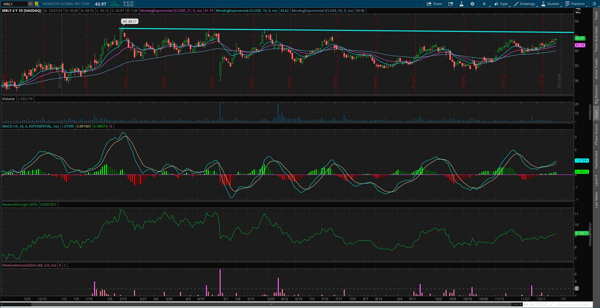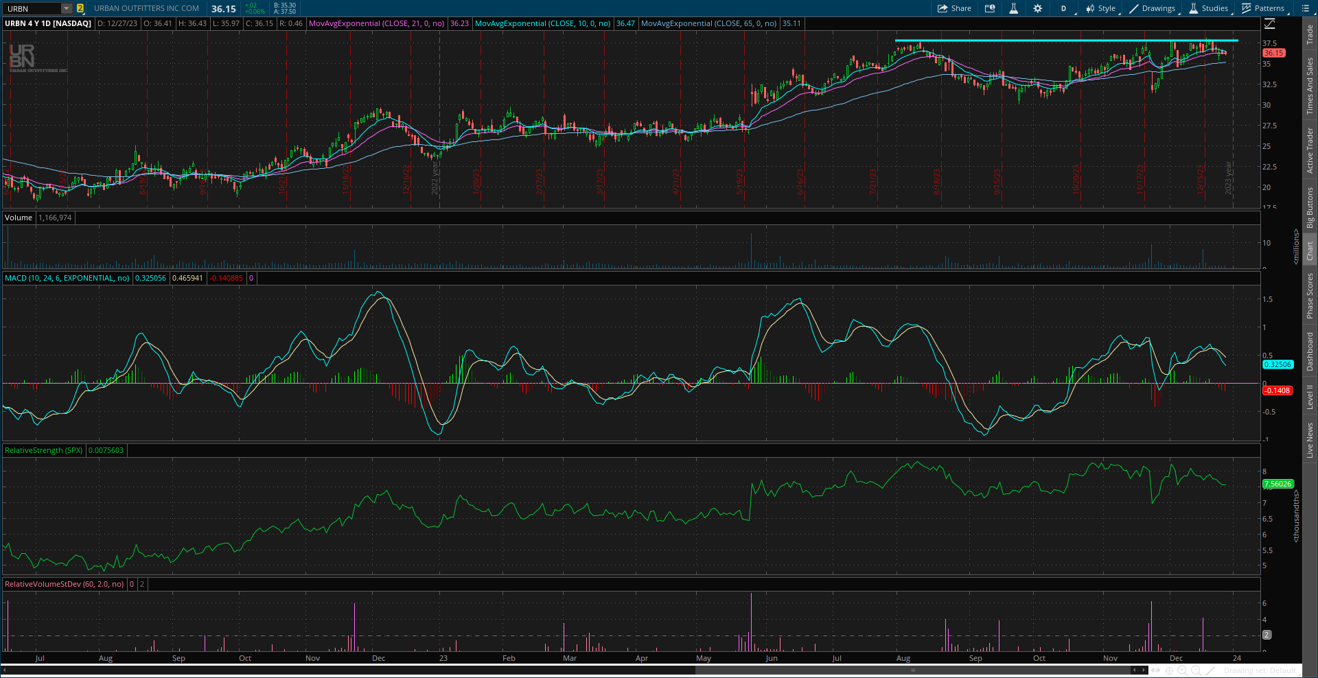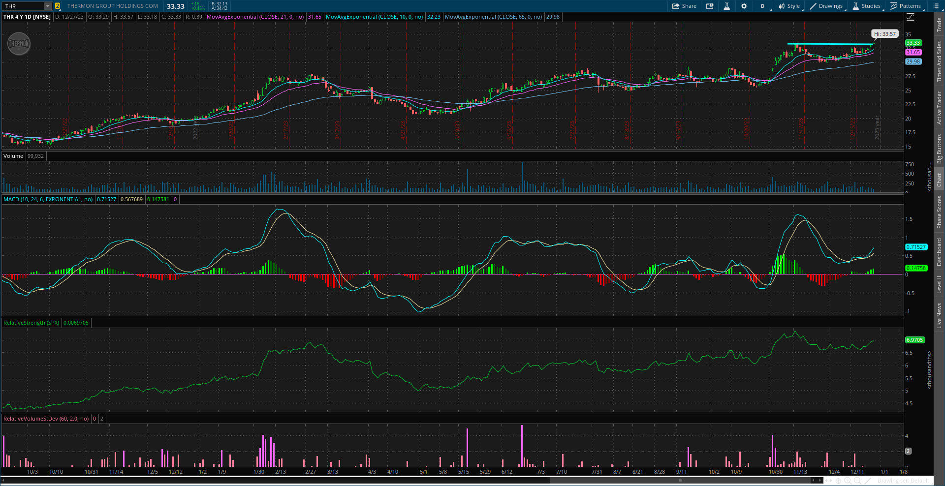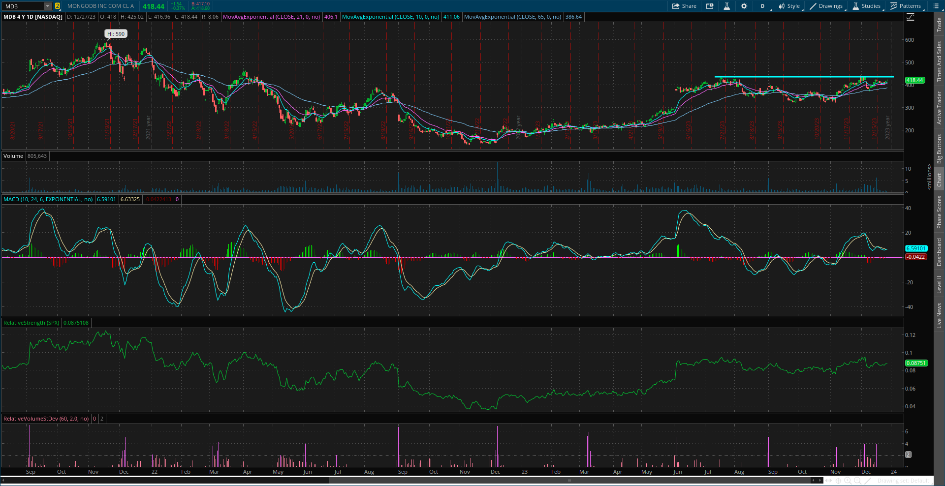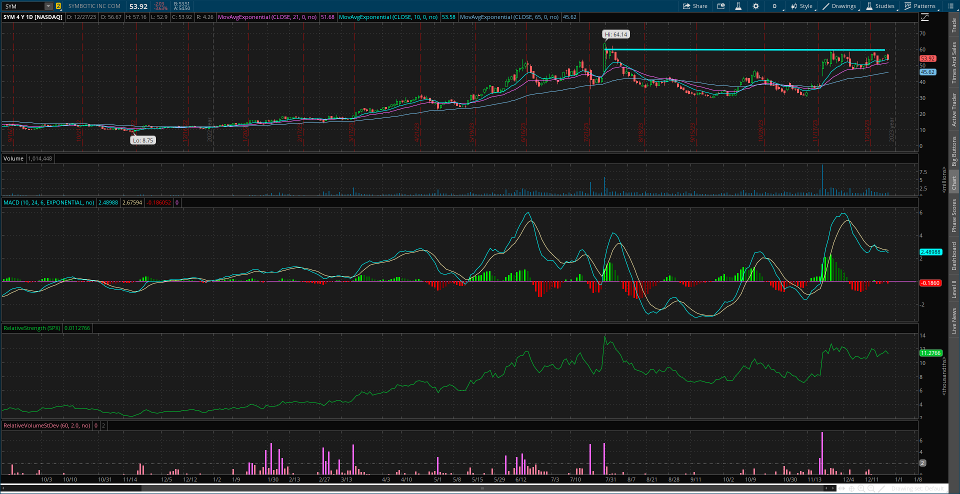 Big run over the past few weeks to test resistance around $60. Need to see momentum reset for another move, so ideally the stock trades sideways for a period to reset the MACD at the zero line. If that happens, I would look to buy a breakout to new highs confirmed by rising volume and the RS line at new highs.