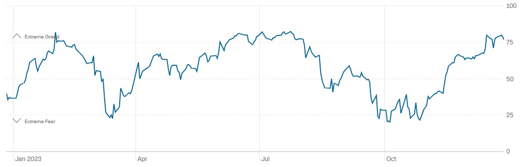 As you would expect, bullish sentiment across various metrics are surging higher. The AAII survey of retail investors shows bullish views at 52.9%, which is the highest level all year. The NAAIM survey that tracks positioning by active fund managers suggests they’re the most invested since the S&P 500 last peaked in July. And CNN’s Fear & Greed Index is firmly in “extreme greed” territory as you can see in the chart below. That’s sparking fears that investors are growing more complacent with greed becoming too elevated, where a sharp pullback is needed to clear out speculative excesses.