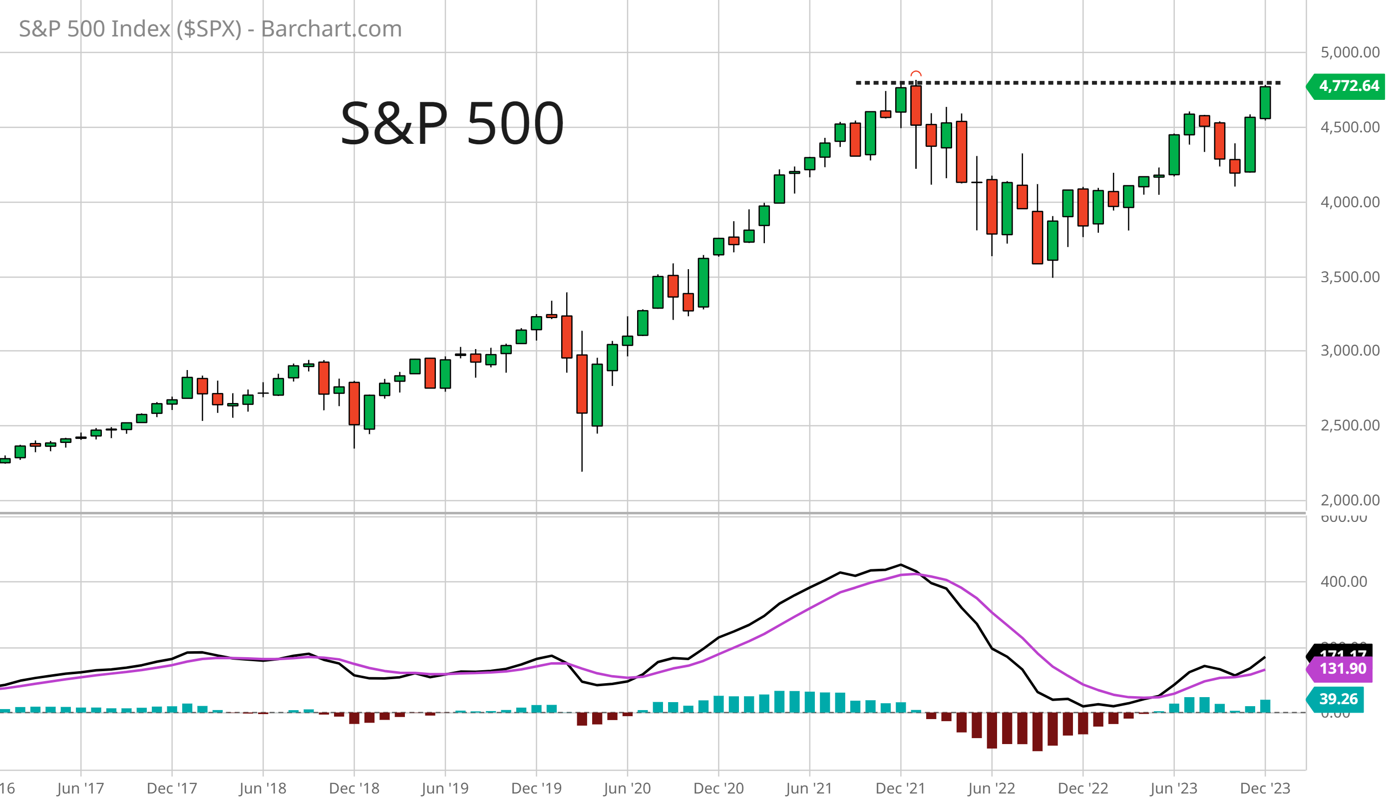 While this holiday-shortened week has been light on headline volatility and economic reports, seasonal trends keep tracking regardless. The calendar period marking the Santa Claus rally runs through Wednesday next week and is delivering a gain so far for the S&P 500. I also highlighted about a month ago that the period covering Thanksgiving week through the Santa Claus rally is one of the best seasonal stretches of the year. That historic backdrop is supporting the breakout in the Dow Jones Industrial Average to new all time highs, while the S&P 500 isn’t far behind as you can see with the monthly candlestick chart below.
