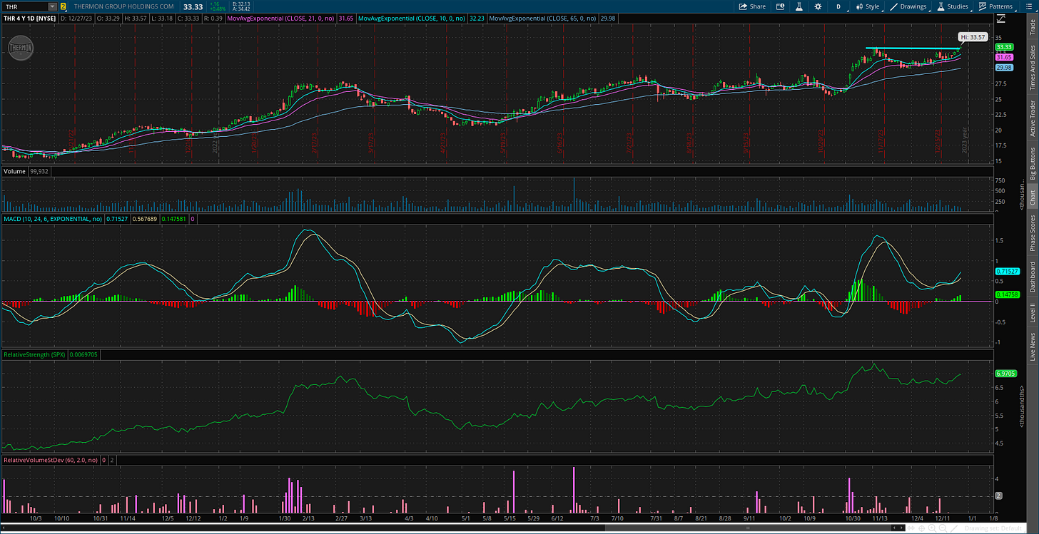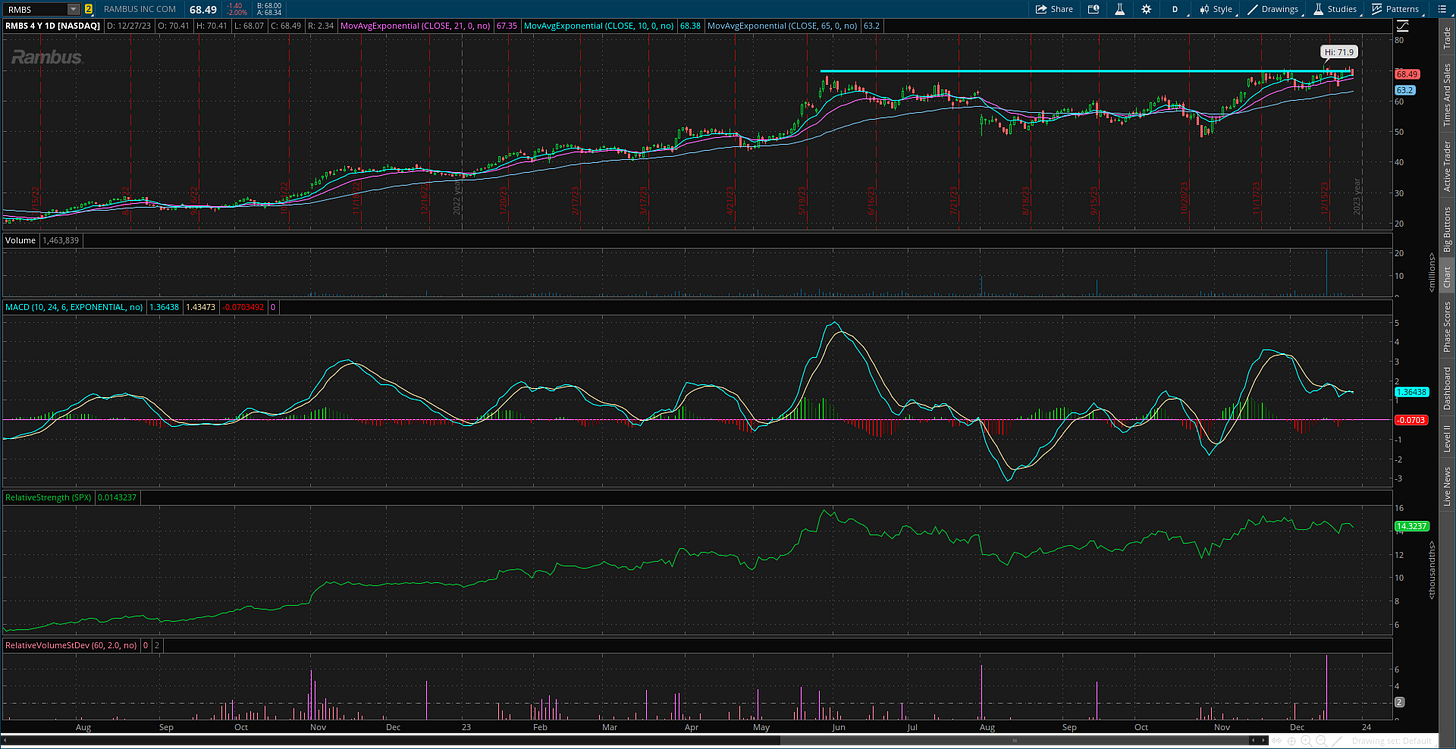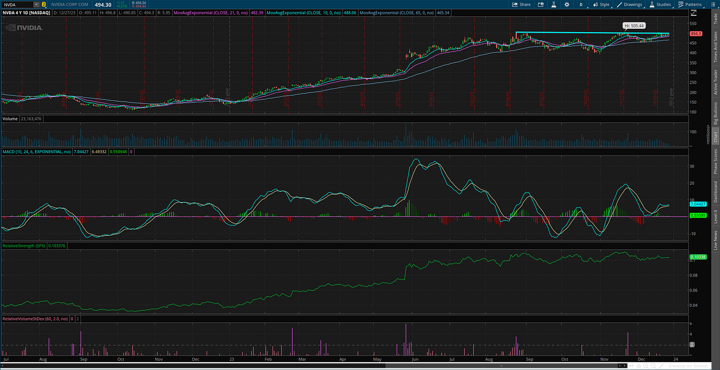 Historic seasonal tendencies can keep the rally going into 2024, but I’m not making trading decisions based solely on seasonal patterns. I ultimately follow the stock market’s trend and participation in that trend, and the backdrop is the most bullish we’ve had in quite some time as indicated by the number of stocks making net new 52-week highs across the major stock exchanges. For this week, I’m adding a new trade idea while also removing SPSC from watch as the stock breaks above price resistance to complete its pattern.