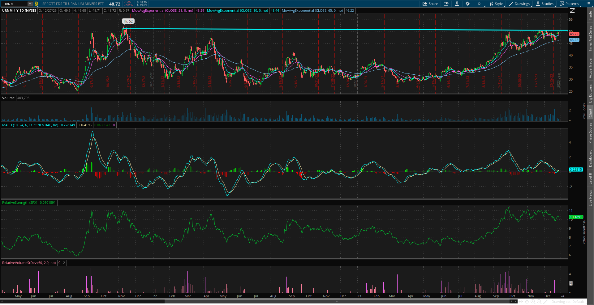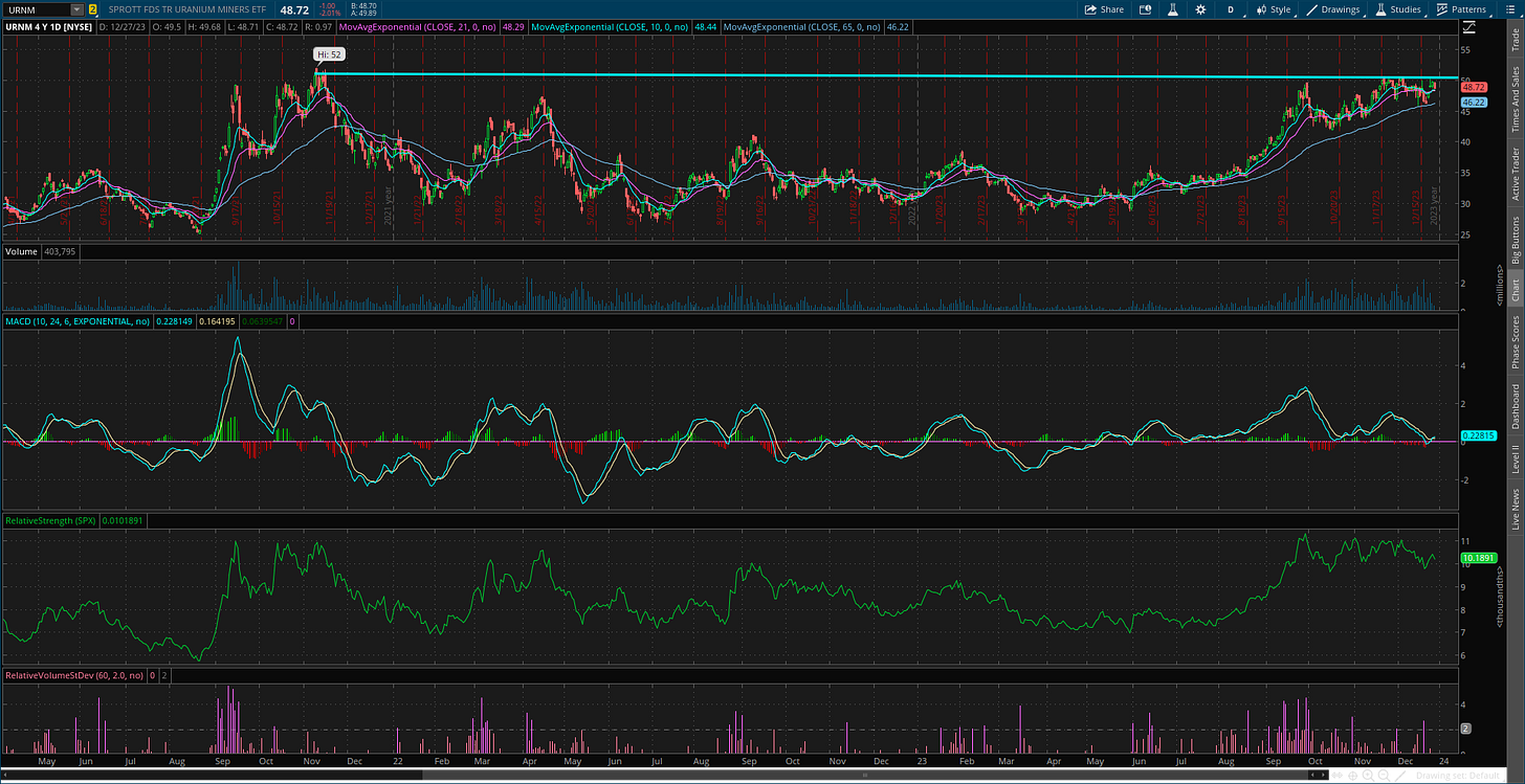 Uranium stocks could be basing for another move higher. The URNM uranium ETF is recently pulling back after testing resistance again at $50. Now seeing another MACD reset which can help a breakout attempt.