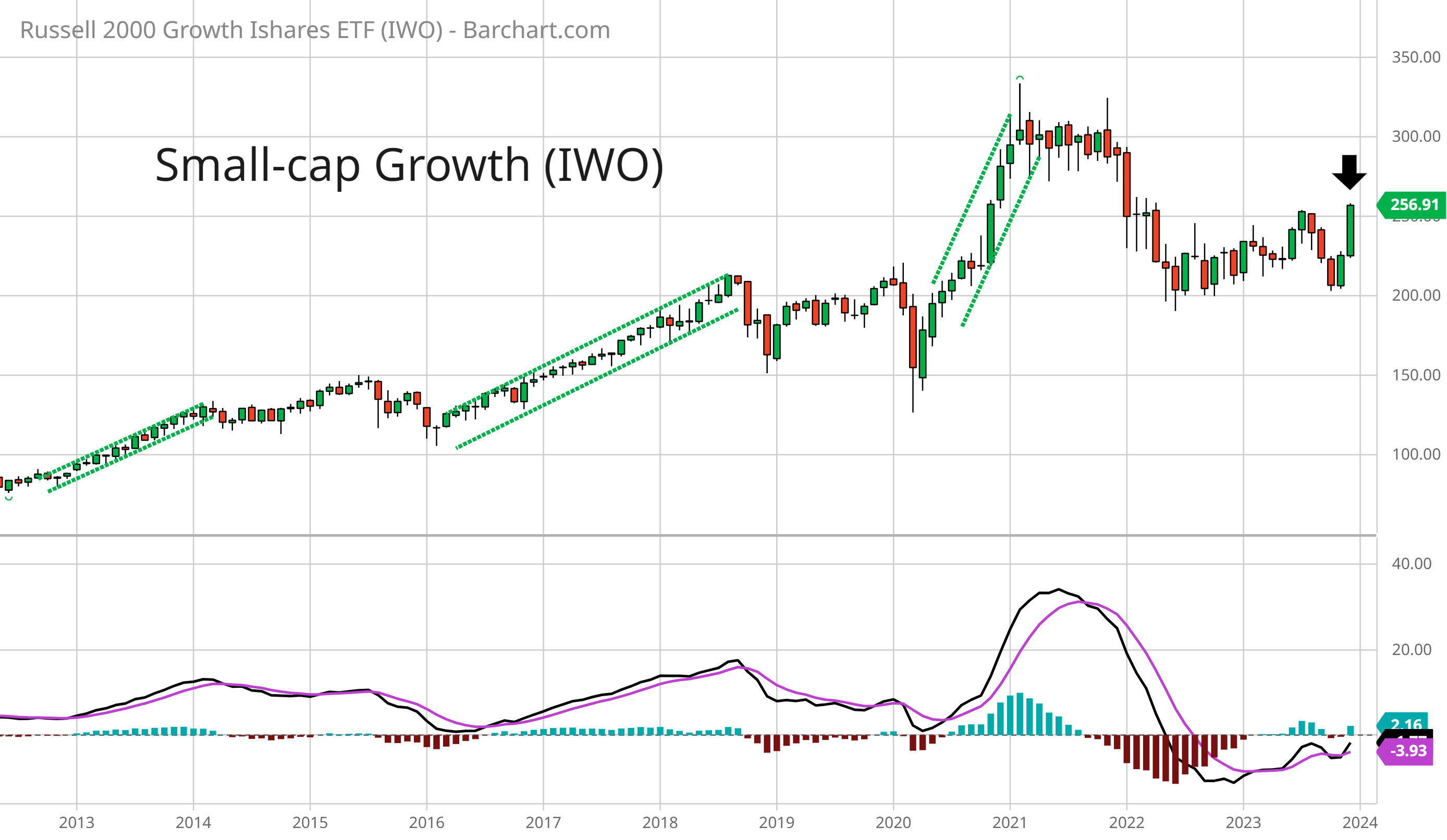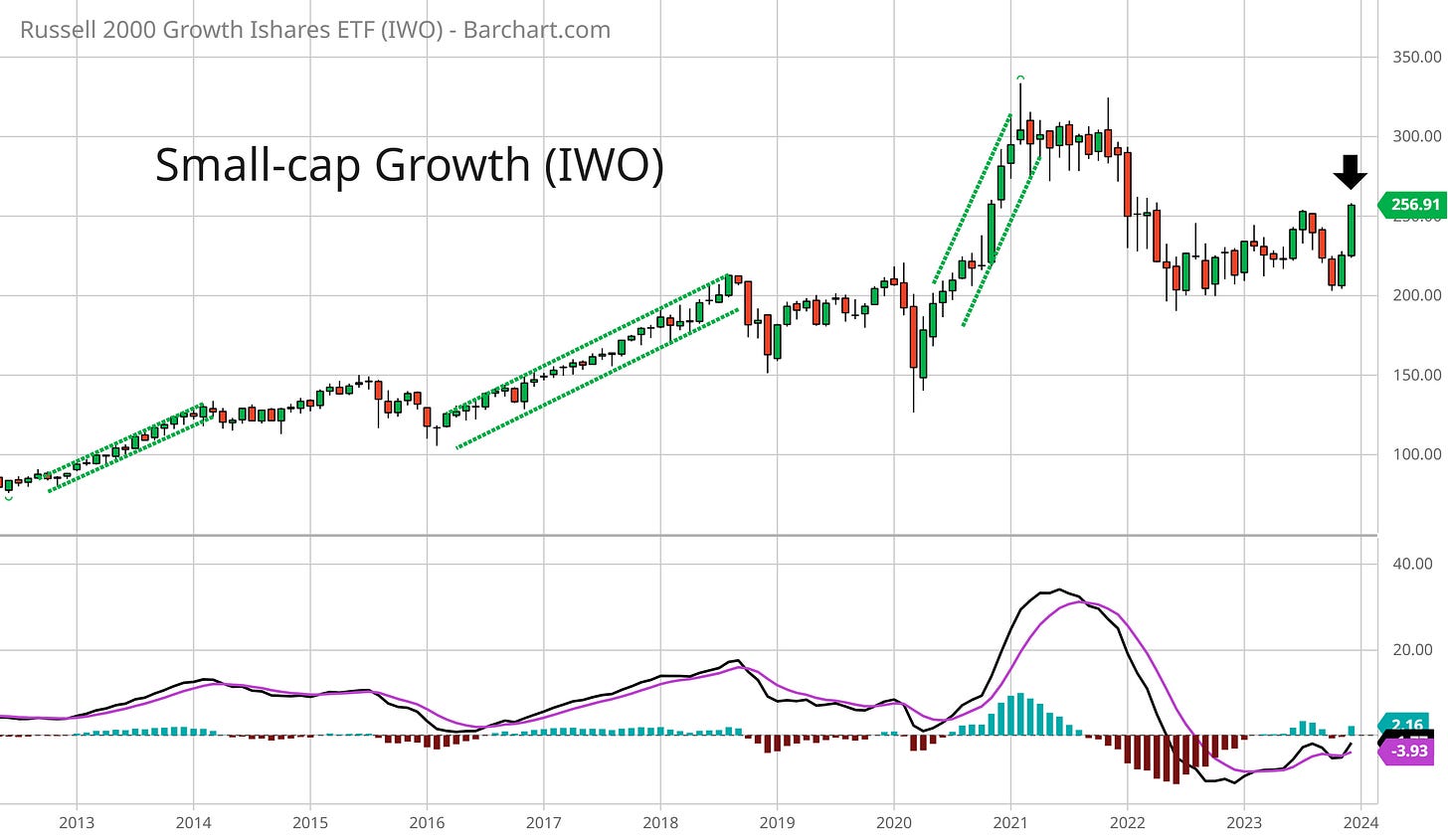 But as I noted here, sentiment signals work best when you also detect breadth divergences, and we’re just not seeing bearish divergences yet. A key defining feature of the rally in the stock market since late October is much stronger participation in the trend by the average stock. Another important development as we head into 2024 is the performance of small-cap growth stocks that you can track with the IWO ETF. During past “easy” trading environments like in 2013 and 2017, small-cap growth is in a clear uptrend. You can see in the monthly chart of IWO below that October saw a higher low relative to 2022’s lows while December might see a higher high compared to July’s peak - possibly indicating the early stages of a new uptrend.