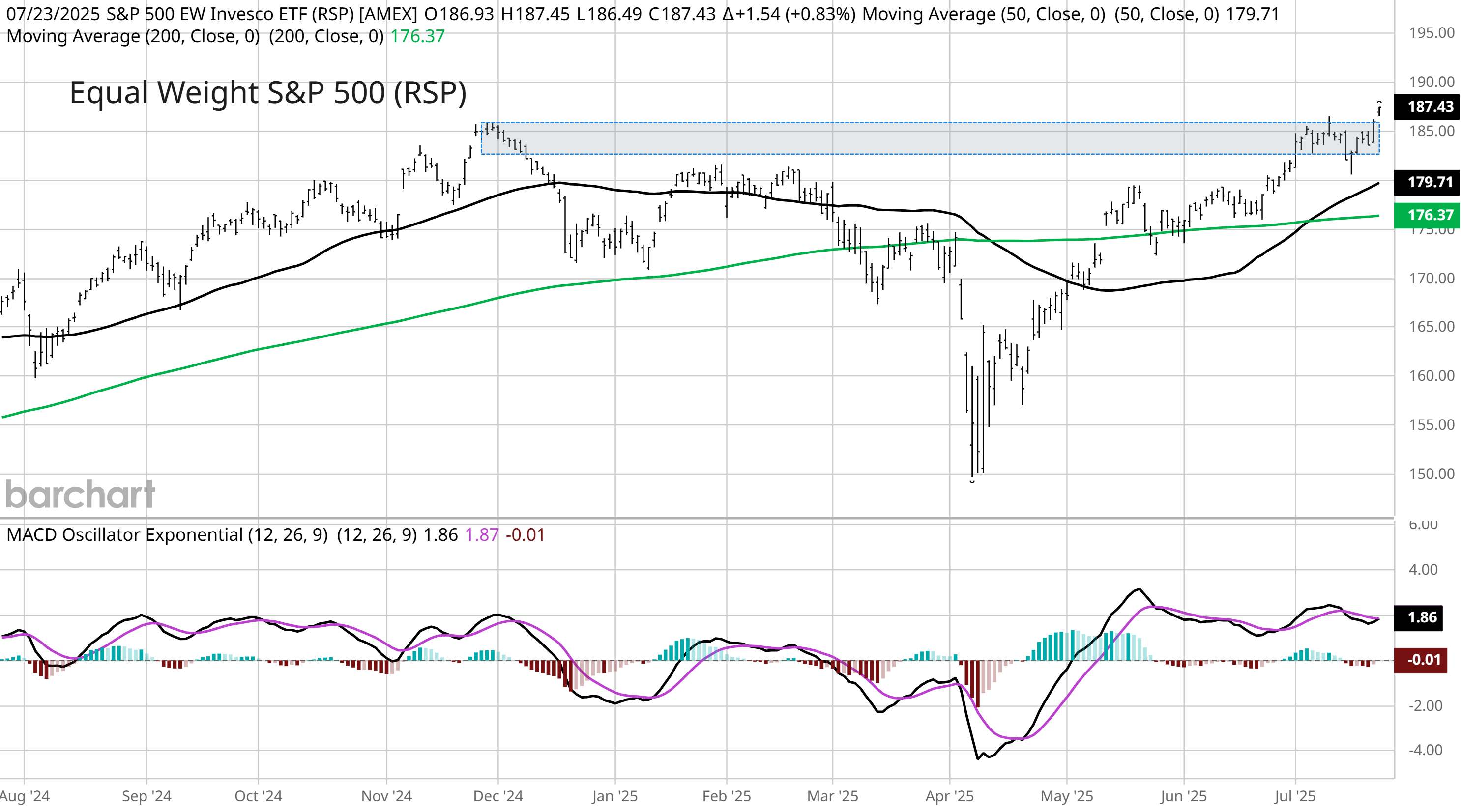 Signs of investor optimism are emerging alongside more trade deals ahead of the August 1 tariff deadline. The S&P 500 is rallying to fresh record highs following news of a trade deal with Japan and positive developments on a potential agreement with the European Union. That puts the S&P 500 up more than 27% from the early April lows. The S&P has also spent 61 days in a row above its 20-day moving average, which is the best streak since 1998. What’s even more encouraging with recent market action is breadth expansion. The Invesco S&P 500 Equal Weight ETF (RSP) tracks the average stock in the S&P, and is taking out a key resistance level and moving to new highs (chart below).