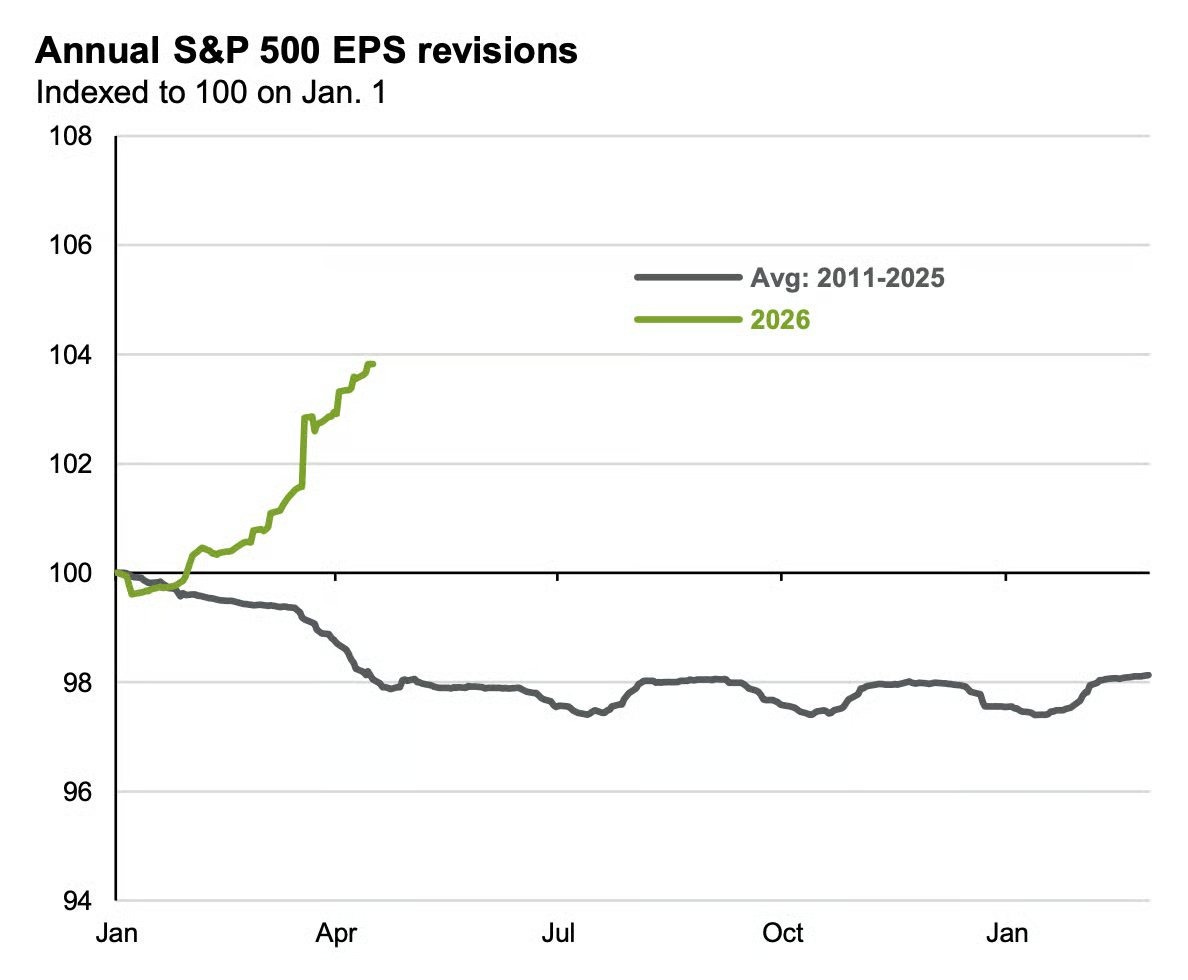 With the S&P 500 and Nasdaq back at record highs, that means valuations remain stretched above historical averages and that earnings growth will be critical to support gains in the indexes going forward. While there is significant uncertainty around the impact to consumer spending and expenses incurred by various businesses from the ongoing war in the Middle East and surging energy prices, forward earnings estimates are doing something peculiar. Earnings revisions for 2026 are now up approximately 4% since the start of the year (green line in the chart below), which compares to the typical revision that drifts lower based on historical data. With the first quarter reporting season about to pick up, it will be crucial to monitor forward earnings estimates for any changes in trend since the start of the year.