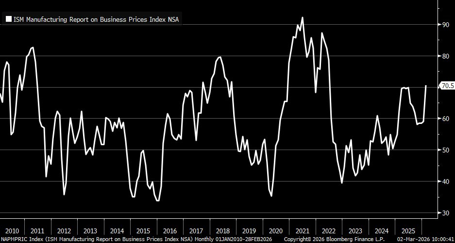 The threat to rising energy and food prices means the impact of the conflict could be extremely inflationary if a resolution isn’t reached soon. Evidence of inflationary pressures are building even before the turmoil in the Middle East. This week saw an updated report on manufacturing activity from the ISM, where a reading above 50 indicates expansion. While manufacturing sector activity is expanding with a reading of 52.4 in February, the prices paid component surged to 70.5 which is the highest level since mid-2022 (chart below). Price paid tends to lead changes in consumer inflation, with the most recent jump occurring before the Middle East conflict broke out.