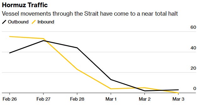 The fallout from the conflict in the Middle East continues having a cascading impact on various sectors of the capital markets. The U.S. and Israel are continuing their strikes against targets inside Iran, while Iran retaliates with missile and drone attacks impacting various countries in the region. From a disruption standpoint, the production and flow of key energy products is being impacted the most. About 20% of the world’s oil and liquified natural gas transits the Strait of Hormuz off Iran’s southern coast, where fears are growing over an extended closure. The chart below shows that traffic in the strait has essentially ground to a stop. It’s also worth noting that the strait is a major chokepoint for ingredients in farming fertilizers like urea where around 35% of global exports pass through.