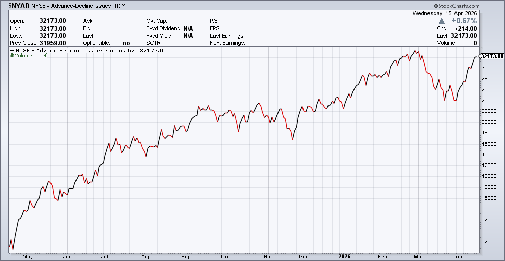 I would not base any investment decision or outlook based on seasonals alone, which is why I’m also watching confirmation from breadth. I’ve previously noted to Hub members that advance/decline stats coming off the late March low have been lackluster and failed to trigger any meaningful breadth thrust metrics despite the sharp gains. Participation by the average stock is also lagging the indexes on the rebound. The equal-weight S&P 500 remains below its record high and is not confirming the cap-weighted S&P’s new record. The NYSE advance-decline line in the chart below is another way to track the performance of the average stock. It’s also failing to confirm the new high in the S&P.