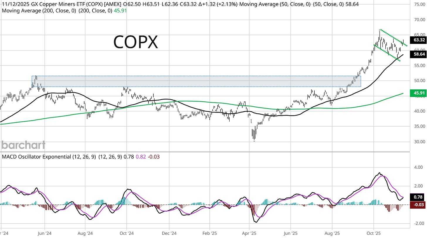 Although it appears that the longest U.S. government shutdown in history will end soon, investors and economists remain without key economic reports released by federal agencies. But there are alternative methods to gauge the health of the domestic economy. Market-based sectors that are sensitive to developments with the economy are evolving favorably, including copper and copper miners. The global LME copper benchmark is on the verge of breaking out from a multi-year bullish ascending triangle pattern, while the Global X Copper Miners ETF (COPX) is breaking out from a bullish flag pattern (green channel) after testing support at the 50-day moving average in the chart below.