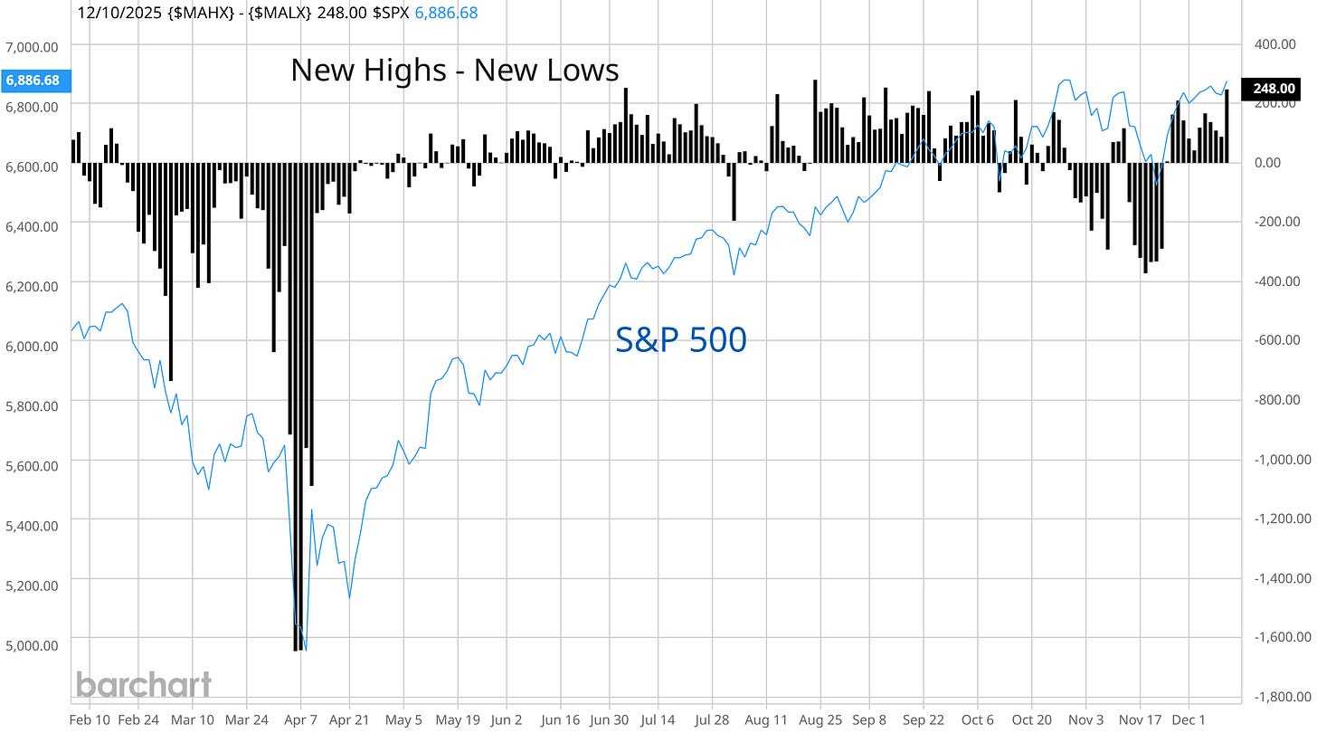 The reaction across the capital markets focused on the more dovish aspects of the meeting to boost financial market liquidity, with stocks rallying while a selloff in the U.S. dollar delivered a boost to precious metals. The action in small- and mid-caps was especially strong, which follows a period of strong breadth heading into Thanksgiving week. The broadening rally helped drive a spike in net new 52-week highs in the chart below, which takes the difference between new 52-week highs and new lows. Net new highs topped one of the highest levels seen this year following the reaction to the Fed.
