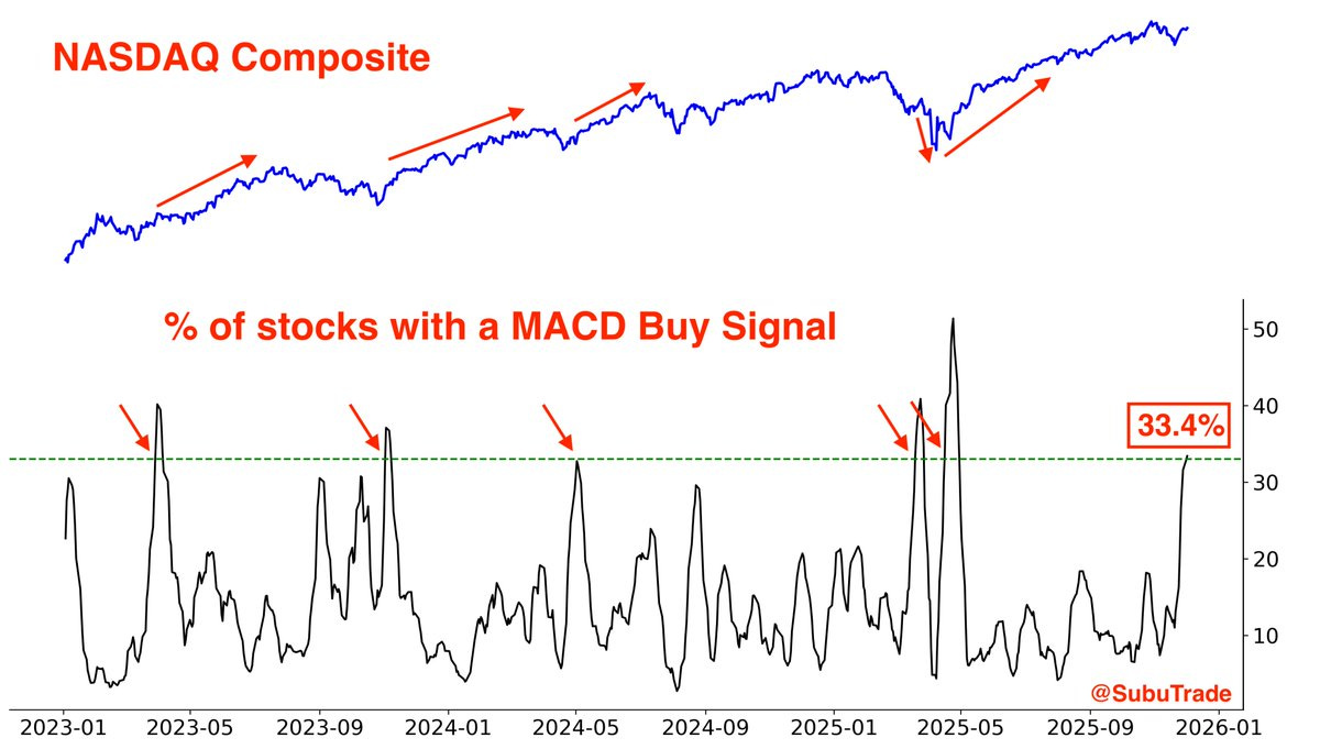 Along with other economic reports and inflation data due this week, that sets the stage for a highly anticipated Federal Reserve rate-setting meeting next week. While market-implied odds point to an 89% chance of a third consecutive rate cut, deep divisions are emerging on the forward path of interest rates. While that could inject volatility into the stock market, underlying market internals are evolving very favorably for a rally into year-end. Strong breadth on the recent rebound is driving indicators of the average stock to new highs ahead of the cap-weighted indexes. In addition to breadth thrusts, strong gains across the average stock is creating momentum thrusts as well. The chart below looks at the percent of stocks in the Nasdaq Composite with a MACD buy signal. That figure has surged to the highest level since coming off the trade war selloff, and historically has preceded a strong period of forward returns.