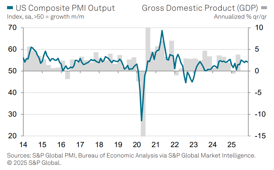 A report covering the manufacturing and services sector of the economy is portraying strong output with demand picking up. S&P Global’s US Composite PMI was reported at 54.2 in November which was a slight drop from October’s reading. But a level above 50 signals expanding economic activity, and aligns with solid expected GDP growth historically (chart below). The report also noted that activity in the services sectors was supported by the strongest increase in new business volumes since last December. But not all underlying components were positive, with the prices paid figure jumping to the highest level in six months. Various PMI reports continue to warn of inflationary pressures building.