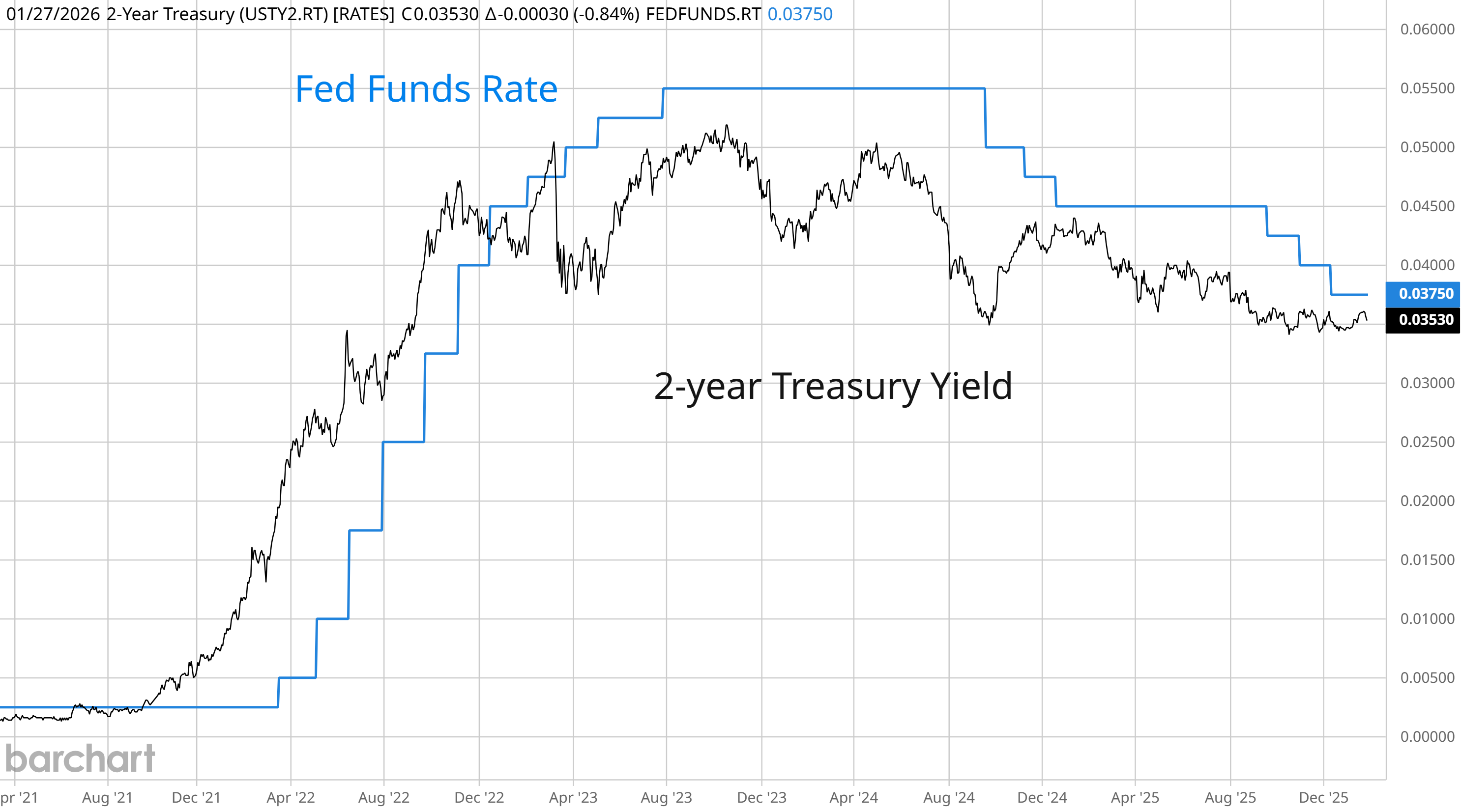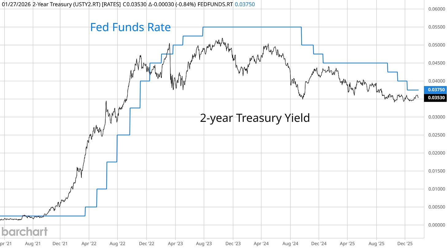 For the first time since July, the Federal Reserve voted to keep interest rates unchanged at a range of 3.50-3.75%. The move followed three consecutive meetings of cuts, while the underlying tone of the meeting statement and Fed Chair Jerome Powell’s remarks is being interpreted as a hawkish pause. That’s because the meeting statement eased concerns over the health of the labor market while also describing economic activity as expanding at a “solid pace.” While the path of interest rates appears more uncertain in the months ahead, it’s worth noting that the fed funds target range and the 2-year Treasury yield have converged at a similar level (chart below). That signals the bond market is aligned with the current level of short-term interest rates.