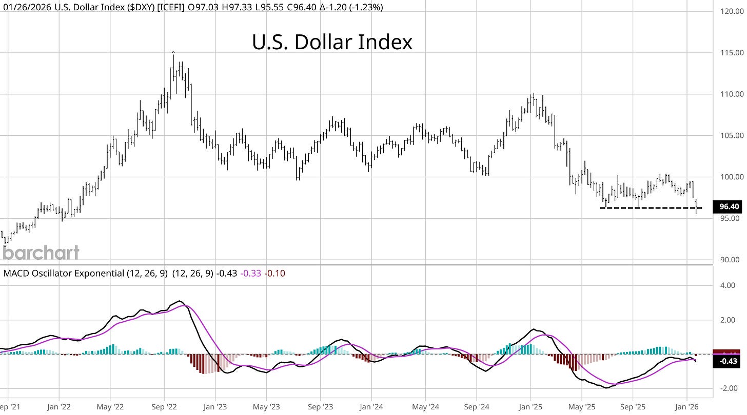 Given further evidence of a solid economy and inflation levels that are running above the Fed’s 2% target, it shouldn’t be a surprise that the central bank paused rate cuts. If anything, inflationary pressures should be building with the rally in various commodities including oil and copper pushing broad commodity indexes above key levels as I highlighted earlier this week. Financial conditions also remain near the loosest levels of the past five years, while a weakening U.S. dollar is also bullish for financial conditions. The U.S. Dollar Index touched it’s lowest level in nearly four years this week before stabilizing (weekly chart below).