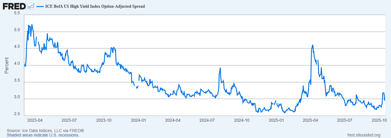 We can also track high yield credit spreads for signs of stress across the capital markets. Spreads measure the cost for high yield issuers to borrow debt above and beyond the cost of debt for a risk-free security like U.S. Treasury securities. You can see in the chart below that spreads are rising from a historically low level during the start of October. Overall, spreads remain contained relative to recent selloff events impacting the stock market like the trade war and volatility around the Japanese yen carry trade unwind during the summer of 2024. A move in spreads above 3.5% would signal growing concern among high yield investors, which would likely happen alongside a steeper selloff in equities.