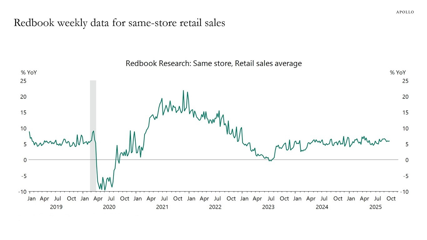 The government shutdown is entering its 19th day, becoming the third-longest shutdown in history. For investors, the shutdown can impact the stock market through two primary avenues. First, the shutdown is estimated to cost the U.S. economy $15 billion for every week the shutdown persists. That amounts to a hit of about 0.2% to GDP each week. At the same time, key government reports covering various economic data are not being released and impacts everything from inflation to jobs and retail sales. Alternative sources of data on the health of the economy are available, and points to the economy holding up. That includes the Johnson Redbook Index, which is a weekly indicator of U.S. retail sales growth (chart below). It tracks same-store sales for a sample of large general merchandise retailers, representing over 80% of the Commerce Department’s equivalent official retail sales data. Retail sales growth continues running near the same range since 2024 around 5%.