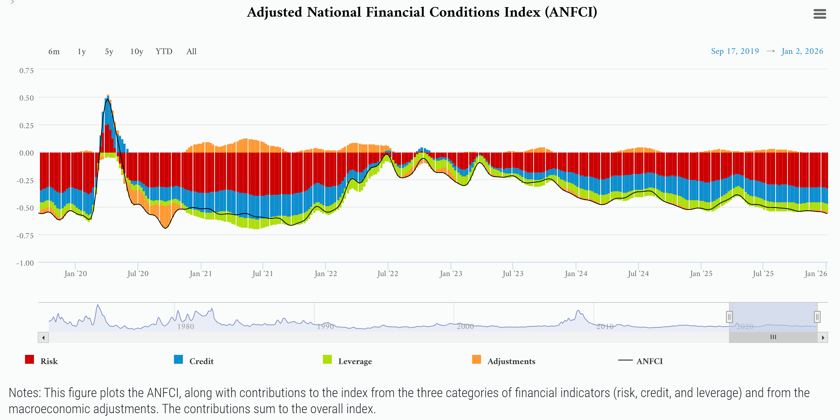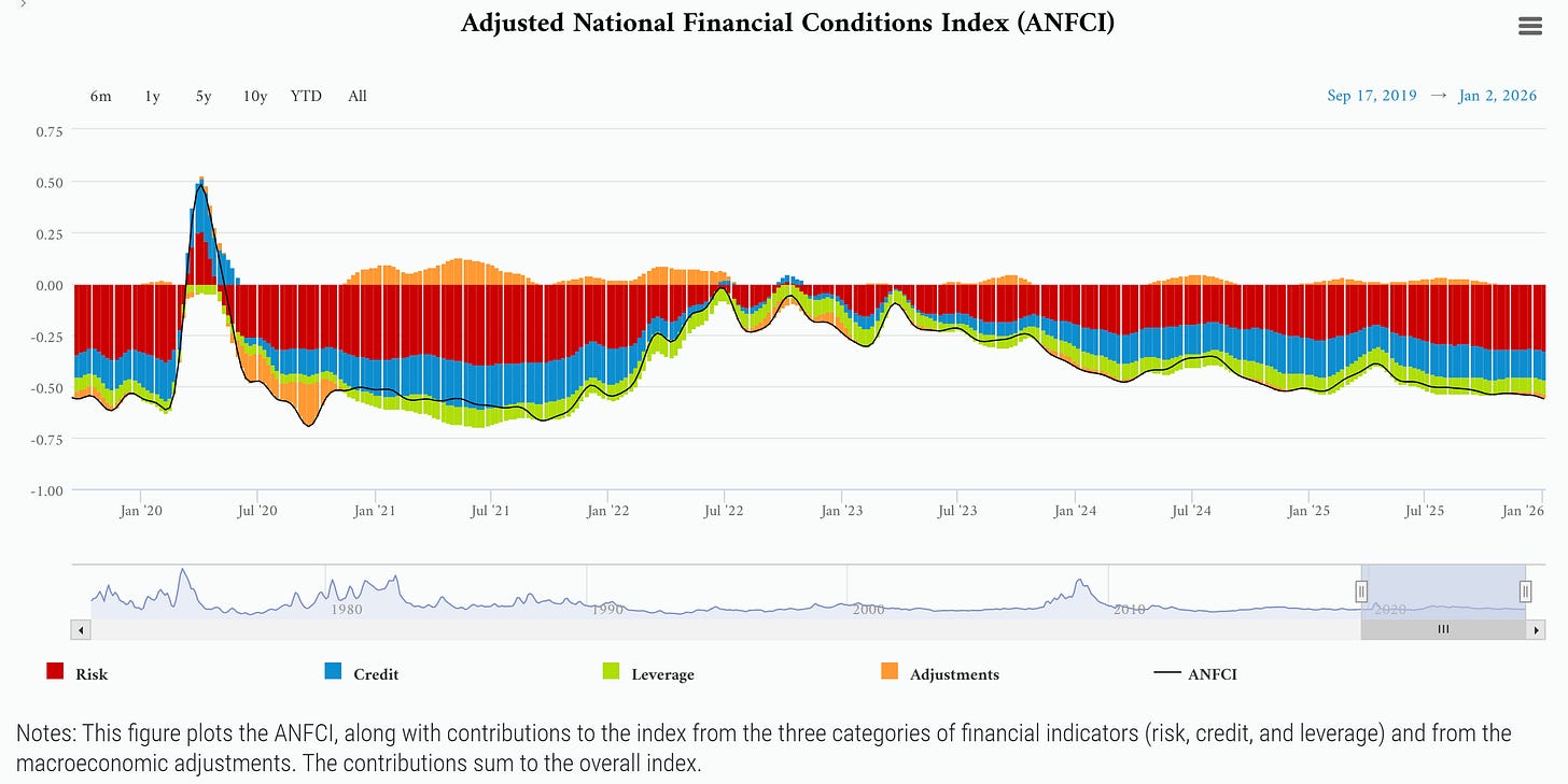 Ongoing deceleration in the pace of job gains and a steadily rising unemployment rate since April 2023 is triggering concerns among economists and has spurred the Federal Reserve to resume its rate-cutting cycle. The Fed has cut for three consecutive meetings, which has brought the fed funds rate lower by 1.75% since the peak in 2024. Not only has the Fed resumed the rate-cutting cycle, but is also back to expanding the balance sheet by purchasing Treasury securities which boosts financial market liquidity. The moves are keeping financial conditions loose, which is correlated with expanding economic activity. The chart below shows the Chicago Fed’s measure of financial conditions, which is running at the loosest levels since 2021.