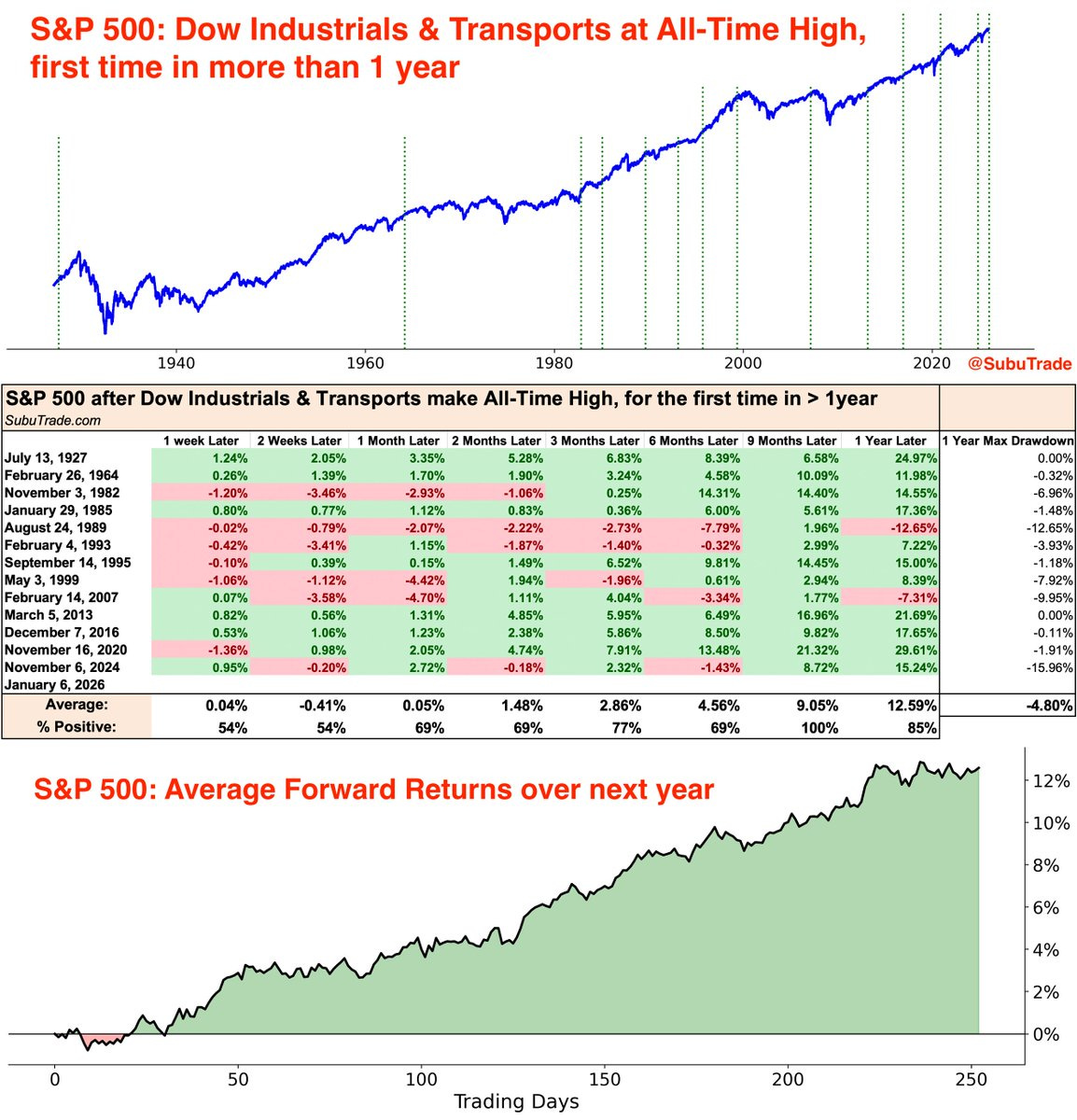 Investors are facing conflicting data on the health of the economy. This is when it’s helpful to turn to the performance of cyclical sectors of the stock market for clues on the status of the underlying economy. Stock prices discount future earnings and business conditions, which makes the performance of cyclical sectors notable to start the year. Small-cap stocks are building on a breakout to new record highs, while industrial and financial sector ETFs are doing the same. There’s also been a recent breakout in transportation stocks to new all-time highs, which is triggering the Dow Theory signal for the first time in over a year. That occurs when the Dow Jones Industrial Average and Transportation Index is making new highs at the same time, which is historically positive for S&P 500 forward returns (table below).