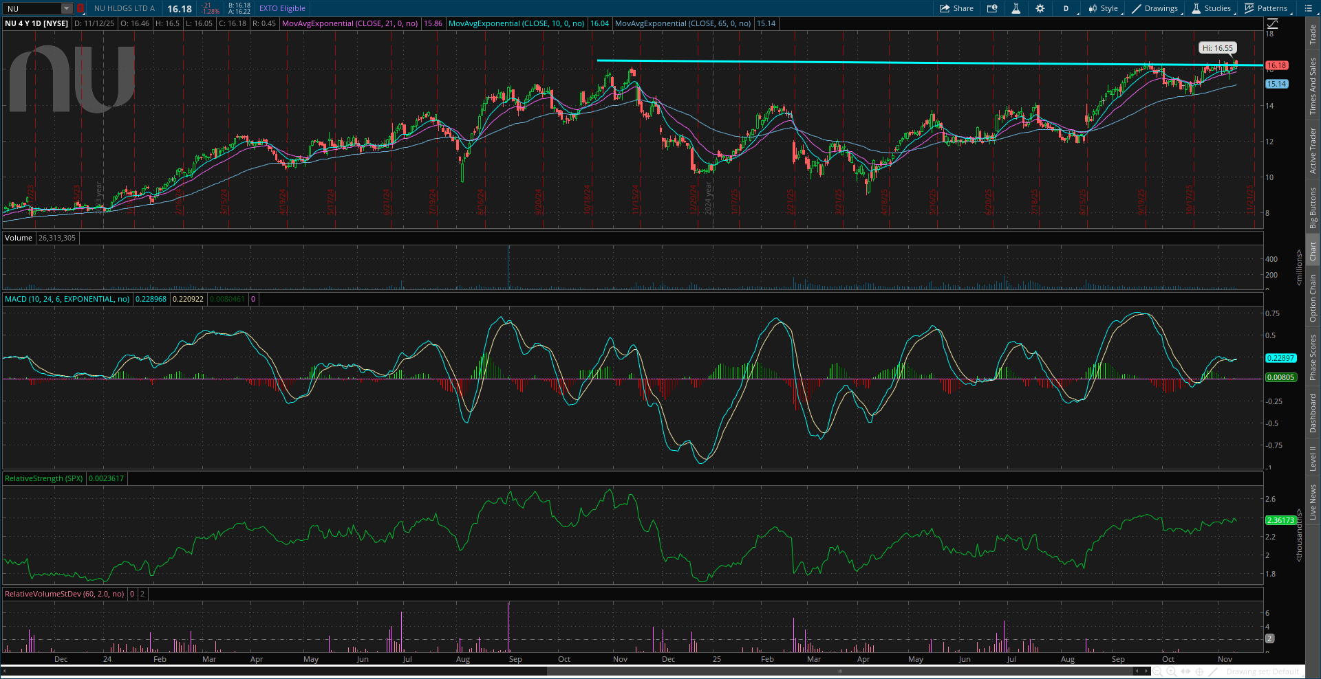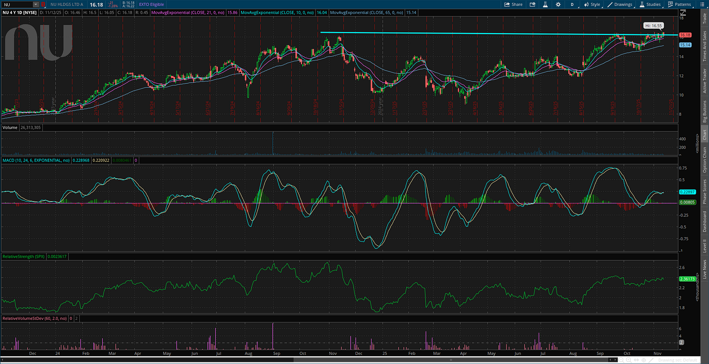 The stock ran to the $16 level in November and started a new basing pattern. NU is making a series of higher lows since April with price back to resistance at $16. The stock needs a smaller pullback to create a MACD hook before breaking out over $16.