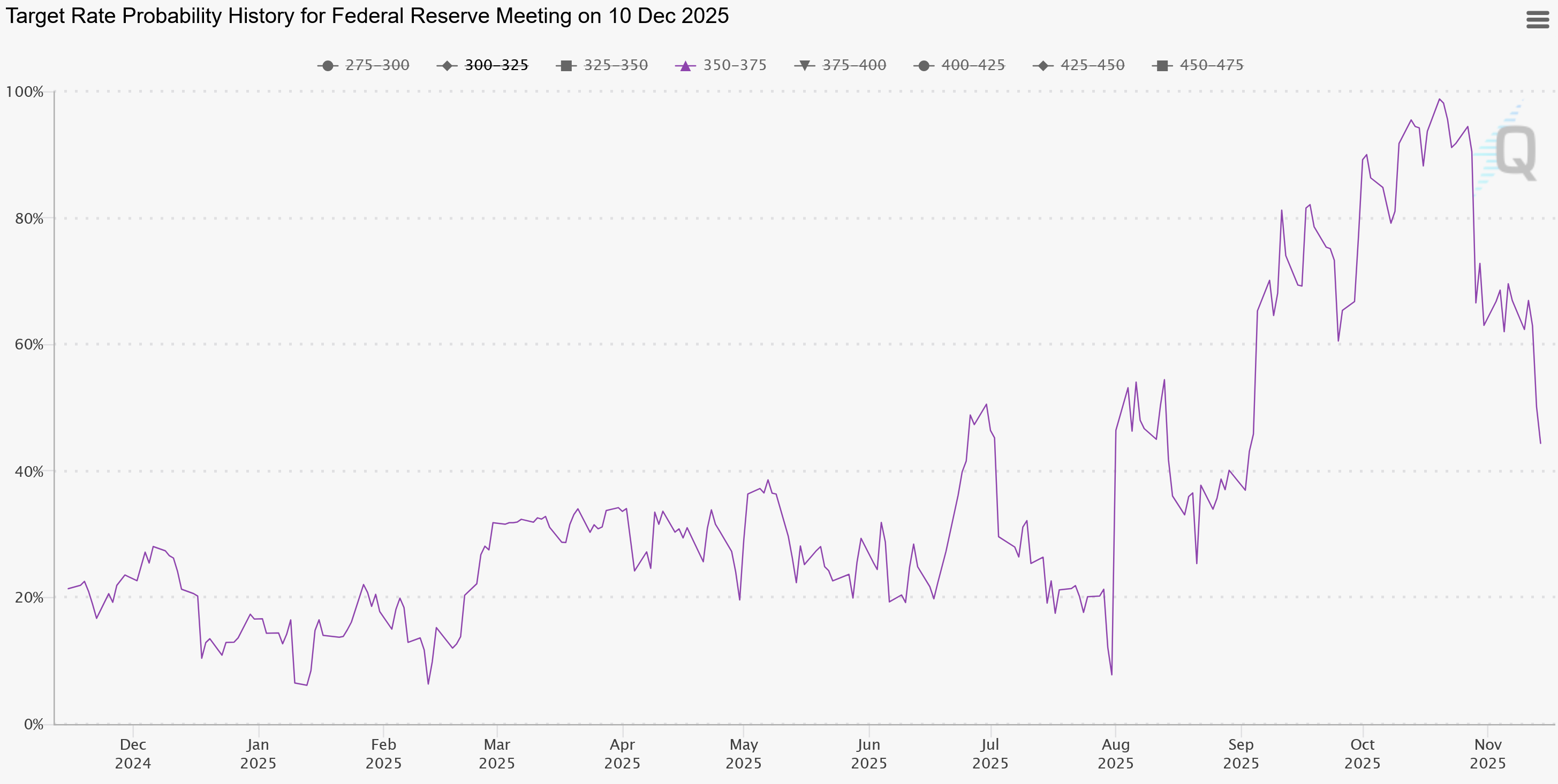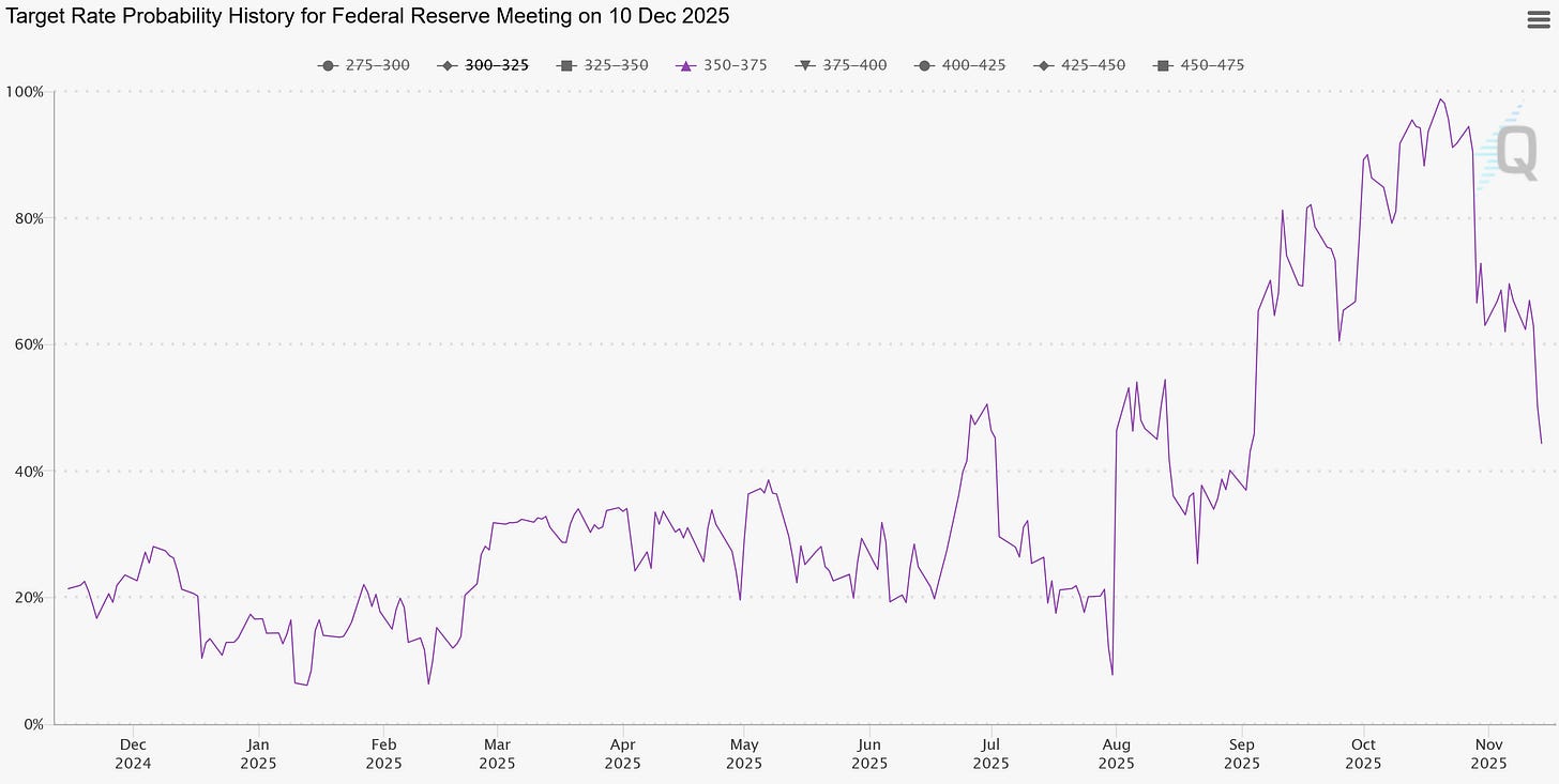 Market-based expectations for a third consecutive rate cut in December has dropped to 44% after being as high as 94% just a month ago. The chart below shows the odds for the fed funds rate to fall another quarter point at the December meeting.