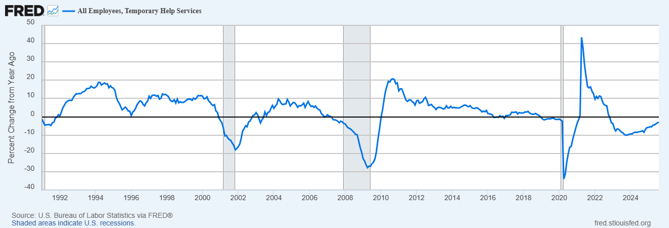 One key factor behind Fed officials voicing concerns over further rate cuts has been resiliency in economic data. Private sector reports on manufacturing and service sector activity have been pointing to accelerating economic data. Fears over deterioration in the labor market haven’t materialized as well. At the same time, leading indicators of labor market activity have been improving. That includes temporary workers that tends to inflect higher before a broader improvement in labor market data. You can see in the chart below that the rate of change in temporary hiring has been moving higher, which could point to a broader improvement in labor market activity ahead.