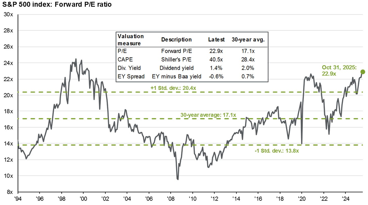 Stock market valuations are nearing some of the most extreme levels in history just as the interest rate tailwind is getting questioned. Falling interest rates boost stock valuations through two main catalysts. Falling rates make the present value of future corporate profits worth more, which is especially impactful for growth stocks whose earnings potential is in the future. Lower interest rates also present less competition for investor capital from fixed income securities. With the outlook for additional rate cuts in question, that leaves stock prices more vulnerable given extended valuations across several measures. That includes the S&P 500’s forward P/E ratio, which at 22.9x is the highest since the internet bubble (chart below).