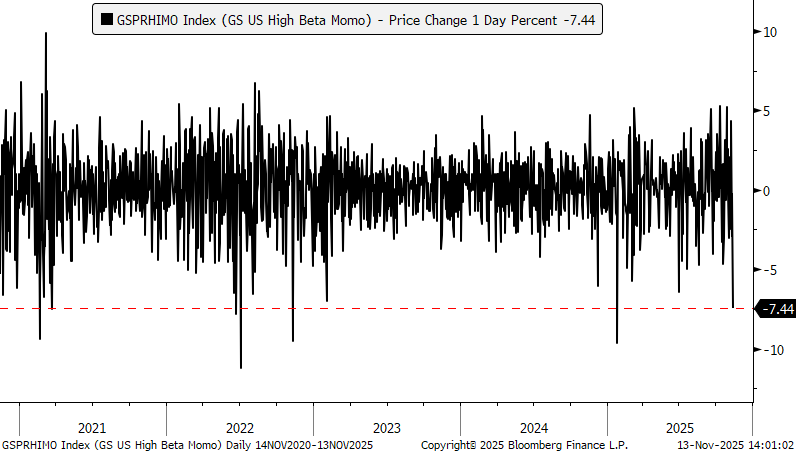 While stock market valuations are collectively elevated, certain sectors are more exposed to the risk of rising interest rates. That includes stocks recently exhibiting strong return momentum and high volatility, like those found in more speculative corners of the stock market. The chart below tracks a basket of domestic high beta momentum stocks, which were showing strong gains as the Fed resumed cutting interest rates back in September. As questions grow around the outlook for further cuts last week, high beta stocks are seeing a quick momentum unwind with the basket having one of its worst single day declines in the past five years.