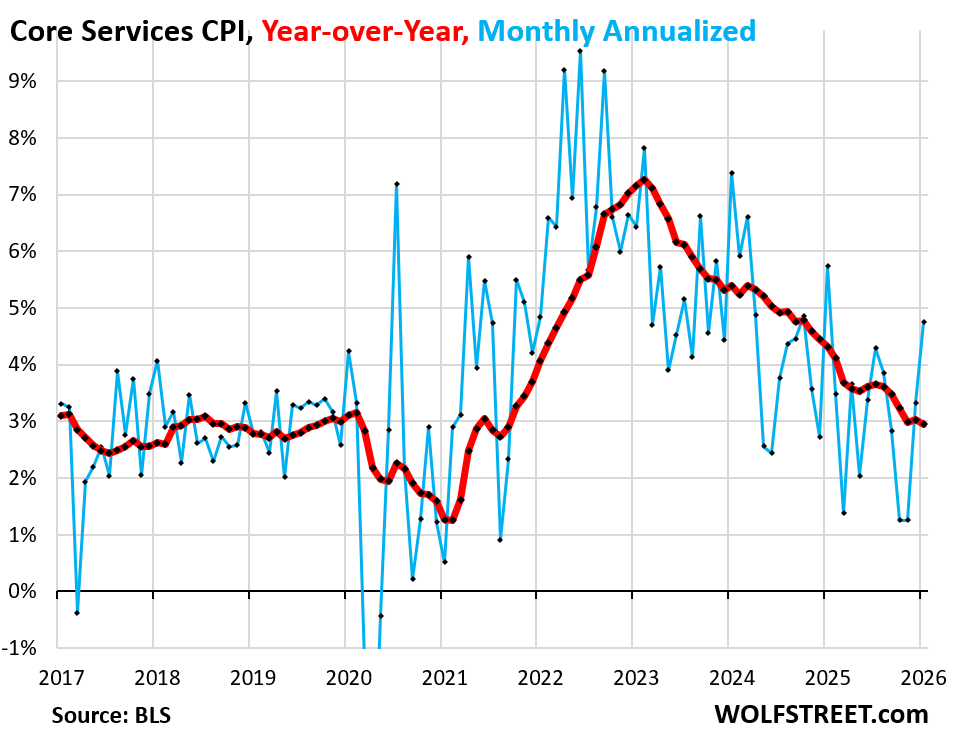 An updated report on consumer inflation looked favorable on the surface, but key underlying components show inflationary pressures continue building. The Consumer Price Index (CPI) came in at 2.4% year-over-year for January, which was below expectations and was the smallest increase since last May. But measures of core inflation continue running at elevated levels. The chart below shows core services CPI, which includes things like housing costs, health insurance, and auto insurance. Core services rose by .4% on a monthly basis or by 4.8% annualized which is the biggest increase in a year. Core services excluding housing (i.e. supercore inflation) jumped by .6% on a monthly basis or 7.3% annualized.
