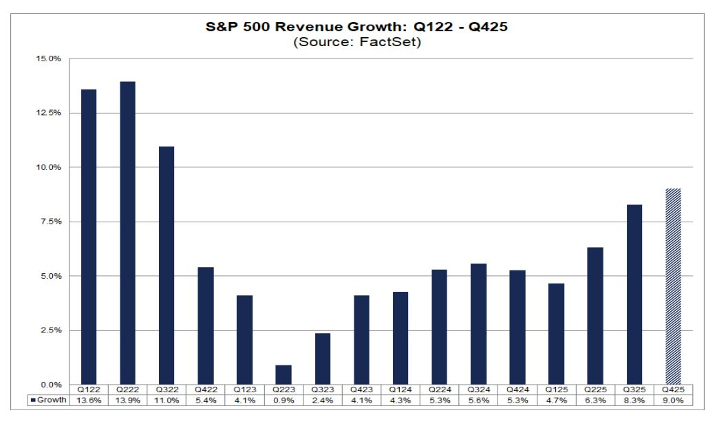 A recovery in economic forecasts is supporting accelerating growth in corporate sales and earnings. Median earnings growth for stocks in the Russell 3000 (a broad market index covering large-, mid-, and small-caps) has been accelerating since the start of 2025 and hit double-digits just above 10% during the fourth quarter. Quarterly revenue has been rising as well. The chart below shows quarterly revenue growth for companies in the S&P 500, which hit 9.0% year-over-year during the fourth quarter. That’s the strongest growth rate seen in over three years.