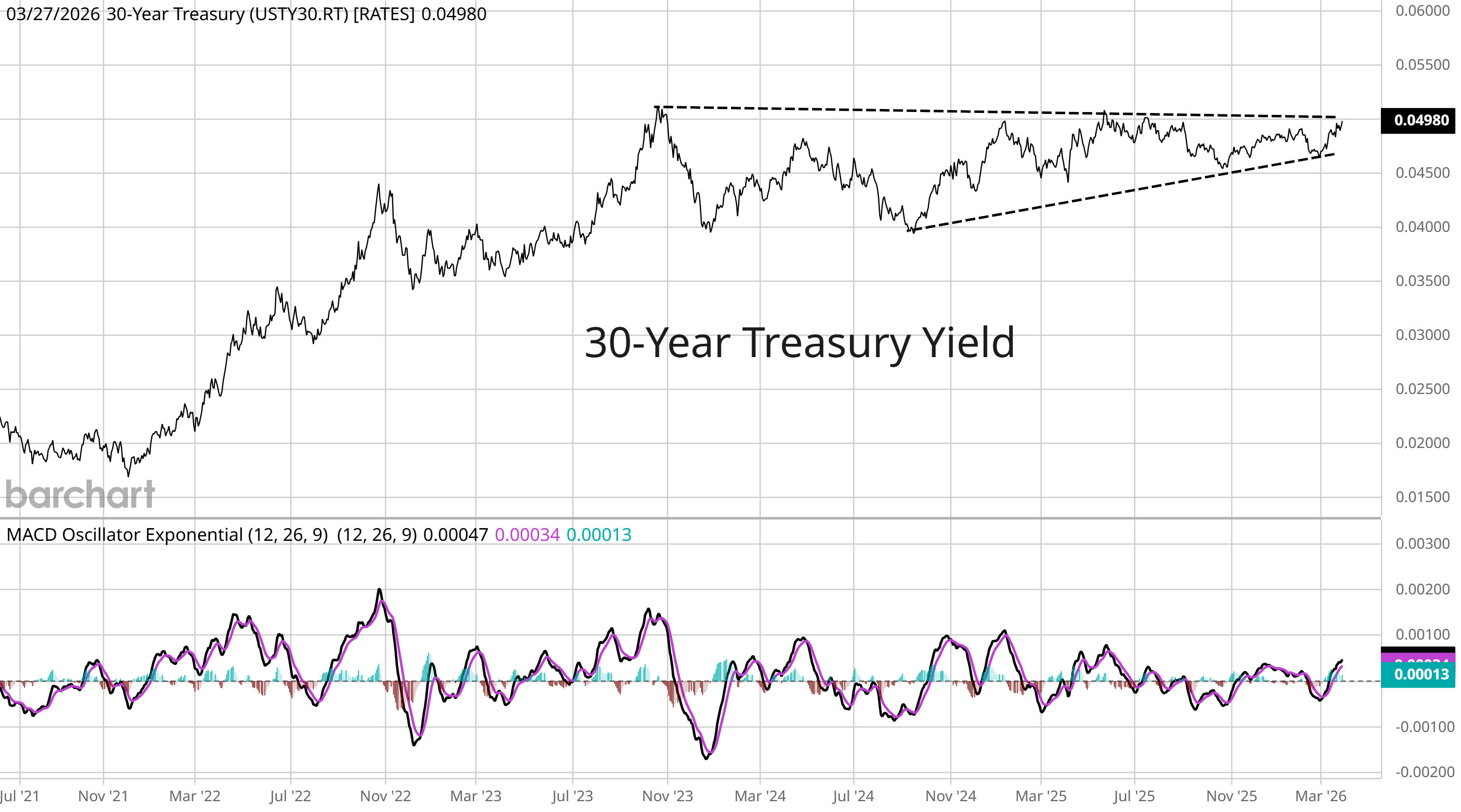 The combination of rising inflation and massive supply of investment grade debt coming to market is major threat to interest rates. The 30-year Treasury yield is already trading in a pattern that could point to a looming breakout in longer-dated rates. The chart below shows the 30-year Treasury yield, which is trading in a multi-year ascending triangle pattern with resistance at the 5.0% level (chart below). The 30-year is close to a major breakout over that level, which would put the 30-year at the highest level since 2007. Rising rates would challenge investors through a couple key avenues. Higher rates (and inflation) pressure stock market valuations, while rising rates also means falling bond prices. The combination of falling stock and bond prices hit retirement portfolios during 2022’s bear market.