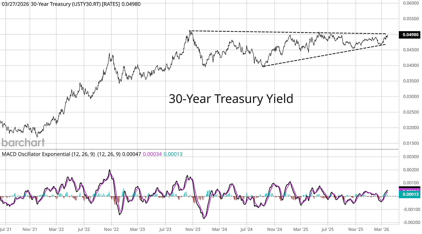 The outlook for rate cuts by the Federal Reserve is in jeopardy, while long-term rates are jumping higher as well due to uncertainty around inflation. The 30-year Treasury yield is close to breaking higher from an ominous pattern that could mean sharply higher rates ahead.