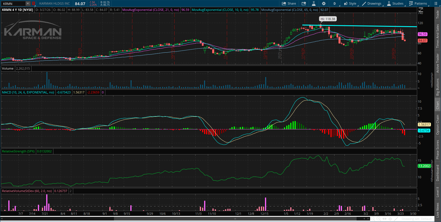Karman peaked near $120 in January and started a new basing process. Following a drop into mid-February, KRMN rallied back toward resistance and is making a smaller pullback that’s resetting the MACD. I’m watching for a move over $110.
