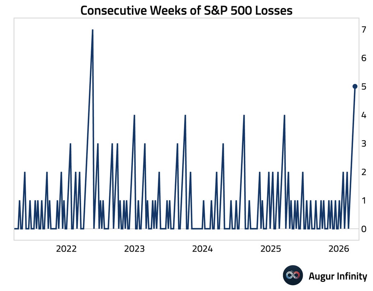 That’s weighing on the S&P 500, which has now closed out five consecutive weeks with a loss. That’s the longest streak of losses since the bear market in 2022, which also occurred alongside an energy crisis following Russia’s invasion of Ukraine.