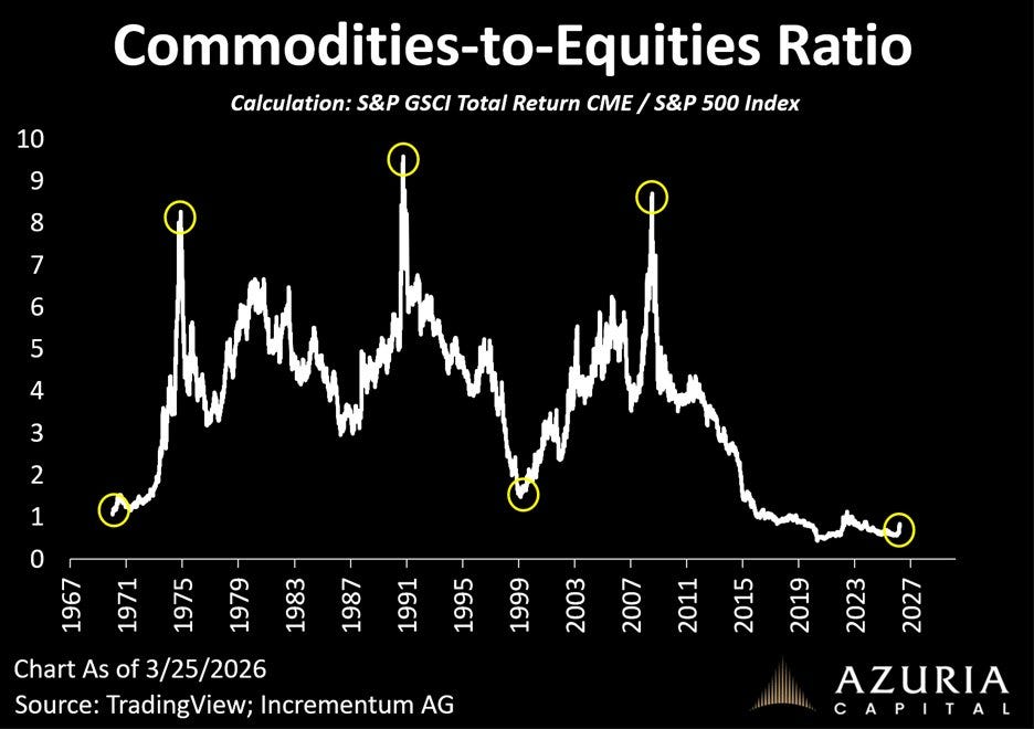 While the sheer weight of the Mag 7 is dragging major indexes like the S&P 500 and Nasdaq lower, late-cycle sectors are experiencing strong rallies. That includes equities across energy-related sectors along with commodities. Commodities were already seeing a boost in recent years following the rally in precious metals followed by copper. The rally in commodities continues broadening, with oil prices driving the the most recent uptrend phase. But commodities could still be in the early stages of a multi-year bull market. The chart below plots a ratio of the commodity prices to the S&P 500. The ratio was pushed to historically low levels during the start of this decade and has only started to inflect higher. Past episodes of a depressed ratio led to sharp mean reversion with commodities outperforming stocks over a period lasting years.