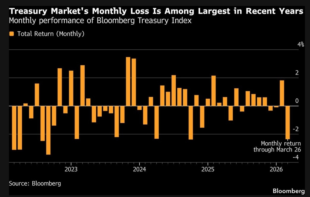 The war in the Middle East is creating a cascading impact on numerous markets through direct and indirect channels. The most direct impact is on energy prices including oil and natural gas. The growing risk of lasting damage on the global economy from high energy prices is pressuring the stocks market. But perhaps the most consequential spillover impact is on the outlook for inflation, and implications for interest rates on both the short- and long-end of the yield curve. Short-term rates are quickly rising as the market starts entertaining the thought of rate hikes, while the threat of rising inflation is causing longer-dated yields to rise as well. That’s sending the overall Treasury market to one of its worst months in the past five years (chart below).