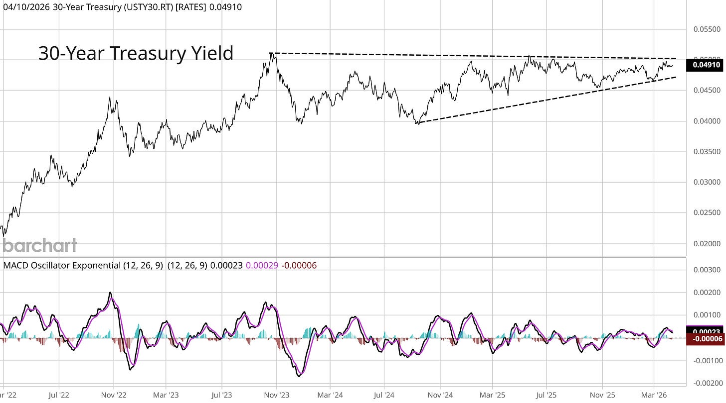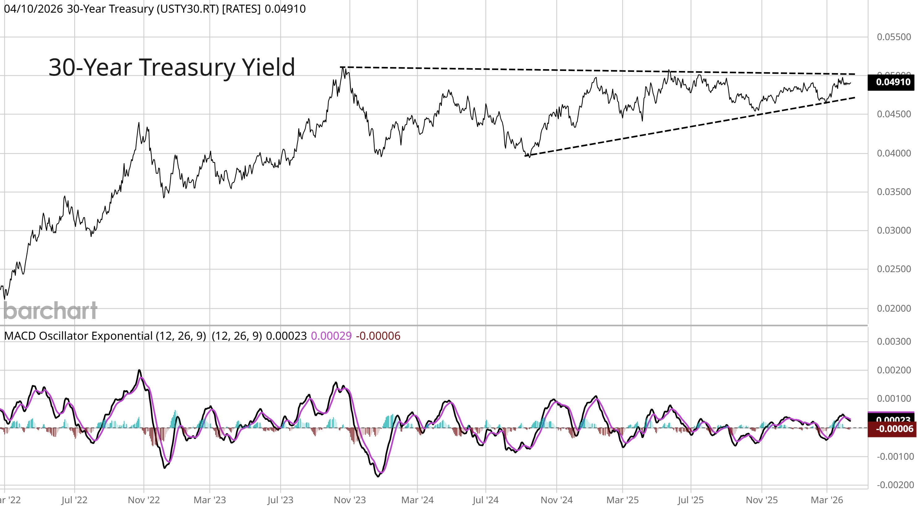 Uncertainty over the inflation outlook is having a major impact on interest rate markets. The 2-year Treasury yield crossed above the fed funds rate for the first time in 3 years, which could signal a pivot by the Fed to tighter monetary policy in the months ahead. On the longer end of the yield curve, the 30-year Treasury is close to a key breakout in the chart below. The 30-year is trading in an ascending triangle pattern since 2023 and is currently making a smaller pullback off the 5% resistance level. A breakout would put the 30-year at the highest level since 2007.