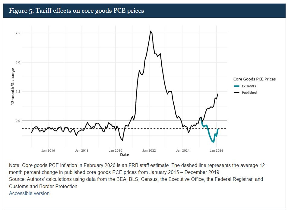 The CPI inflation report for March is the first that captures the move in energy prices following the war with Iran. Gas prices jumped by 21.2% during the month, which is the largest gain in the history of the series going back to 1967. While investors are focused on energy’s impact to inflation looking ahead, more evidence is emerging on the impact of last year’s trade war on the price of goods. A study be researchers at the Fed shows the estimated impact of tariffs on core goods prices in the PCE price index. The chart below shows the published data (black line) compared to estimates excluding the impact of tariffs (blue line). While the economists behind the research estimate that the pass through impact of tariffs is complete, uncertainty on the inflation outlook now shifts to energy prices.