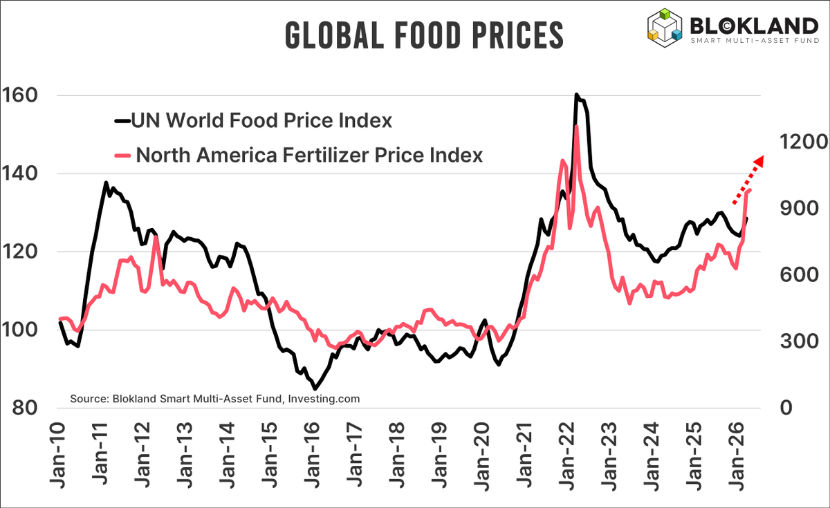 Investors should also monitor the impact of fertilizer shortages on food prices in the months ahead. The Middle East is a key producing region of ingredients used in farm fertilizers, which have also been impacted by tanker traffic through the Strait of Hormuz. Higher fertilizer prices has a direct impact on food prices, while fertilizer shortages could impact crop yields as well. Concerns on the impact have led President Trump to recently warn against price gouging by major fertilizer producers. The chart below overlays an index of food prices (black line) against an index of fertilizer prices (red line). You can see that rising fertilizer and food prices played a role during the last inflation wave into mid-2022, with fertilizer prices tracking higher once again.
