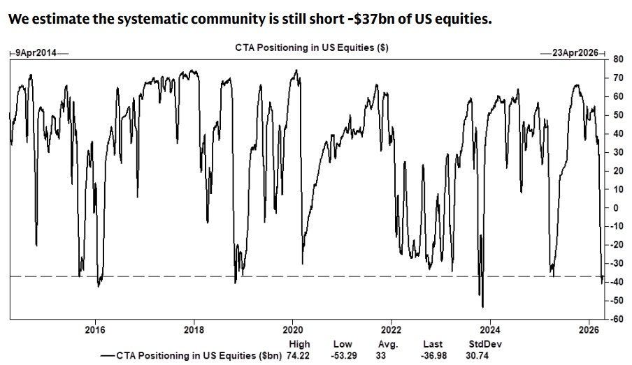 While the two week ceasefire between the U.S. and Iran is on fragile ground, that catalyst was enough to send stock prices soaring as bearish positioning was pushed to extremes. Positive breadth divergences were hinting at a turnaround over the last couple weeks, with an unwinding of massive short positions by institutional investors driving a buying spree. CTAs are systematic investors that incorporate variables like stock price momentum and volatility to drive equity exposure. Their exposure was recently pushed to negative extreme as you can see in the chart below, with the unwind underway still in the early stages. If market volatility remains contained, CTAs could be facing their second largest buy estimate on record over the coming week.