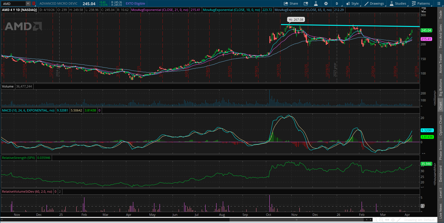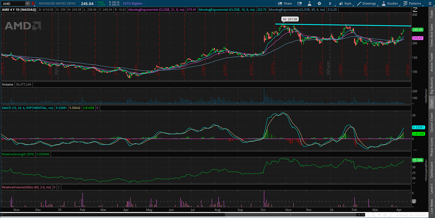 AMD is forming a new basing pattern after breaking above $200 in October. The stock is back testing that level as support several times while forming a new resistance level near $270. I’m watching for a breakout over $270.