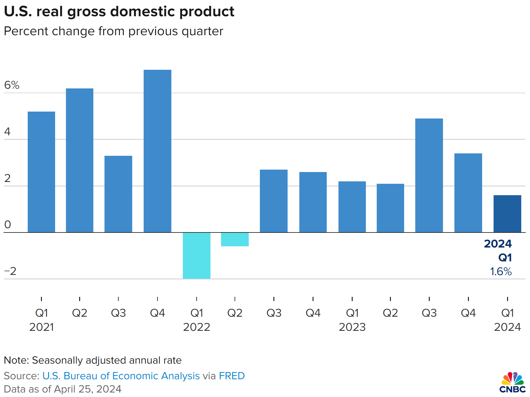 At the same time, the initial look at 1Q gross domestic product (GDP) for the U.S. took a sharp turn lower. 1Q GDP was reported at 1.6% annualized growth compared to expectations for 2.5%. It was the first time GDP growth fell below 2% since the second quarter in 2022 as you can see below.