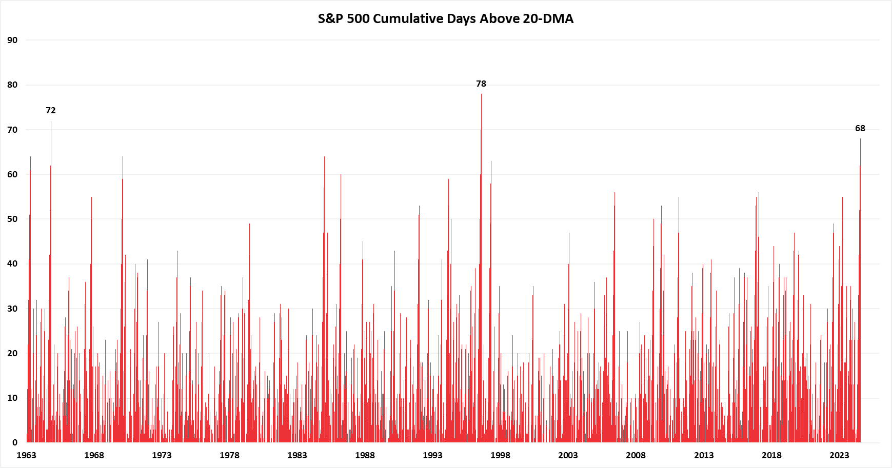 The early April bottom in the S&P 500 and subsequent rally is setting records across a number of metrics. Back on April 9, the NYSE advance/decline volume ratio hit 72 which is the highest reading on record. That showed institutional investors were rushing to buy the brief plunge into bear market, and was followed by other thrust indicators like the Zweig Breadth Thrust. That’s given way to a period of persistent momentum in the S&P, with the index staying above the short-term 20-day moving average for 68 consecutive days (chart below) and is the longest stretch in nearly 30 years.