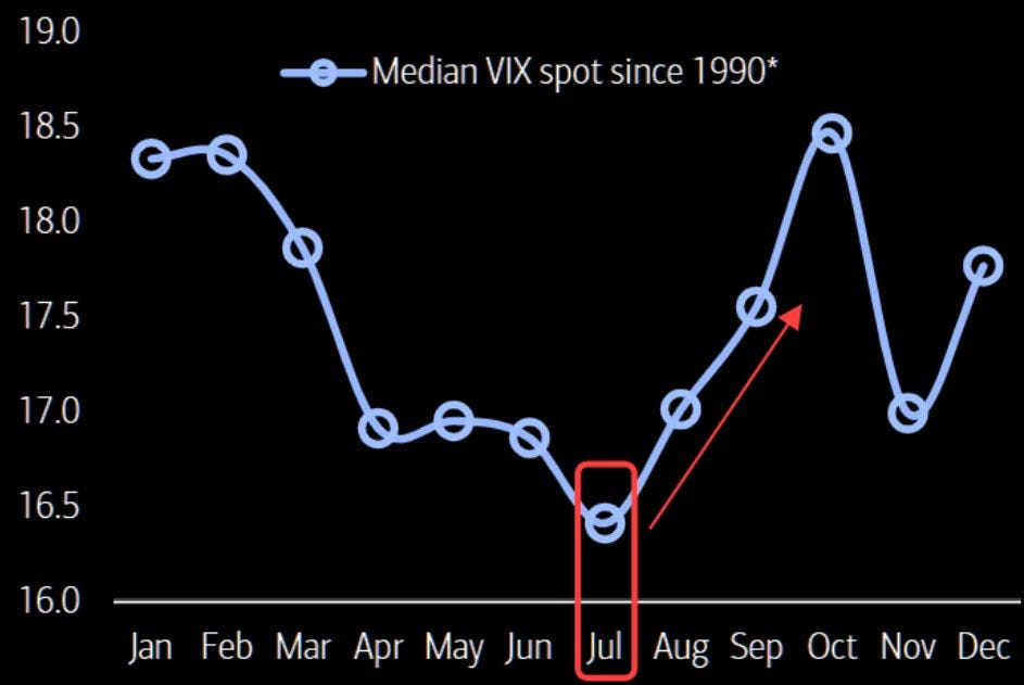 The steady gains in the stock market is driving the VIX back toward its lowest levels of the year. The CBOE Volatility Index (VIX) closed last week at 14.93, which lowest close since February when the S&P made its high before plunging into a bear market. But based on historic seasonal trends, July tends to mark a low point for volatility before a jump over the next couple months (chart below). Low volatility during July reflects the fact that it’s also the best month for S&P returns on average going back to 1928. But calendar seasonality gets more choppy into September and October, which tends to drive the VIX higher.