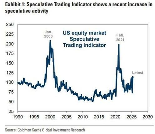 The rally in the stock market is starting to bear resemblance to prior periods of speculative risk taking. The appetite for more speculative stocks is on the rise, with global IPOs recording 539 listings and a 17% increase in proceeds during the first half of 2025 compared to last year. There’s also been a spike in the number of companies coming to market via SPAC, which was a popular vehicle in 2021’s bull market. Goldman Sachs tracks a speculative indicator (chart below) looking at volumes in unprofitable stocks, penny stocks, and companies with extremely excessive valuations relative to sales. It’s on the rise, and recently hit the highest level in over two years.