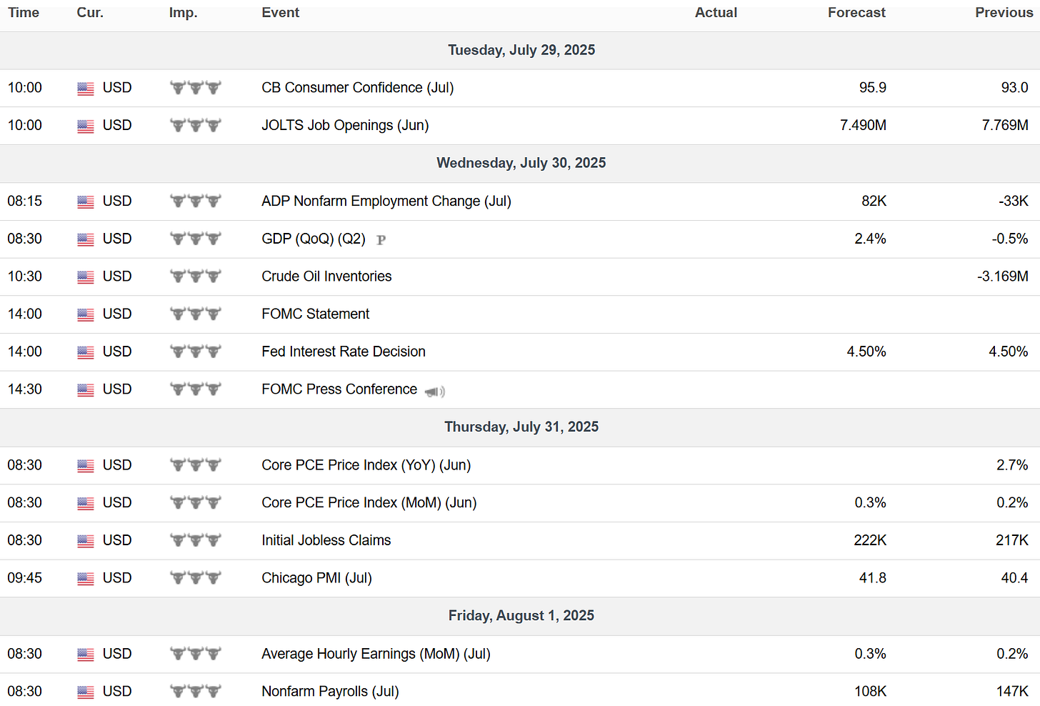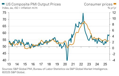 While the pace of quarterly earnings reports continues running at a high pace next week, investor attention will be fixated on the Federal Reserve’s rate-setting meeting. That comes following a high profile visit by President Trump to see renovations at the Fed’s headquarters and to apply further pressure to Fed Chair Jerome Powell to cut interest rates. While the July meeting is widely expected to see no change in rates, investors will be looking for clues on rate cuts during the remaining meetings of the year. Fears over inflation will continue to be a restraining factor on the outlook, with evidence of tariffs impacting the most recent Consumer Price Index (CPI) report. The prices paid component of business surveys are also pointing the way higher. The chart below shows the output prices component (blue line) from the S&P Global PMI report against CPI (orange line). Major inflections in output prices tends to lead CPI historically.