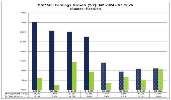 While breadth expansion was an early feature of the rally off the April lows, the average stock in the S&P 500 has been slow to catch the index until now. The Invesco S&P 500 Equal Weight ETF (RSP) tracks the average stock in the S&P and is joining the capitalization-weighted index in making new all-time highs. Better participation by the average stock will be needed to keep the bull market outlook intact, especially as the earnings growth contribution from the “Magnificent 7” looks set to trail off over the coming quarters. You can see that Mag 7 earnings growth starts to trail off quickly starting this quarter relative to last year’s pace (blue bars), while the other 493 (green bars) in the S&P 500 are expected to see accelerating growth rates over the coming year.