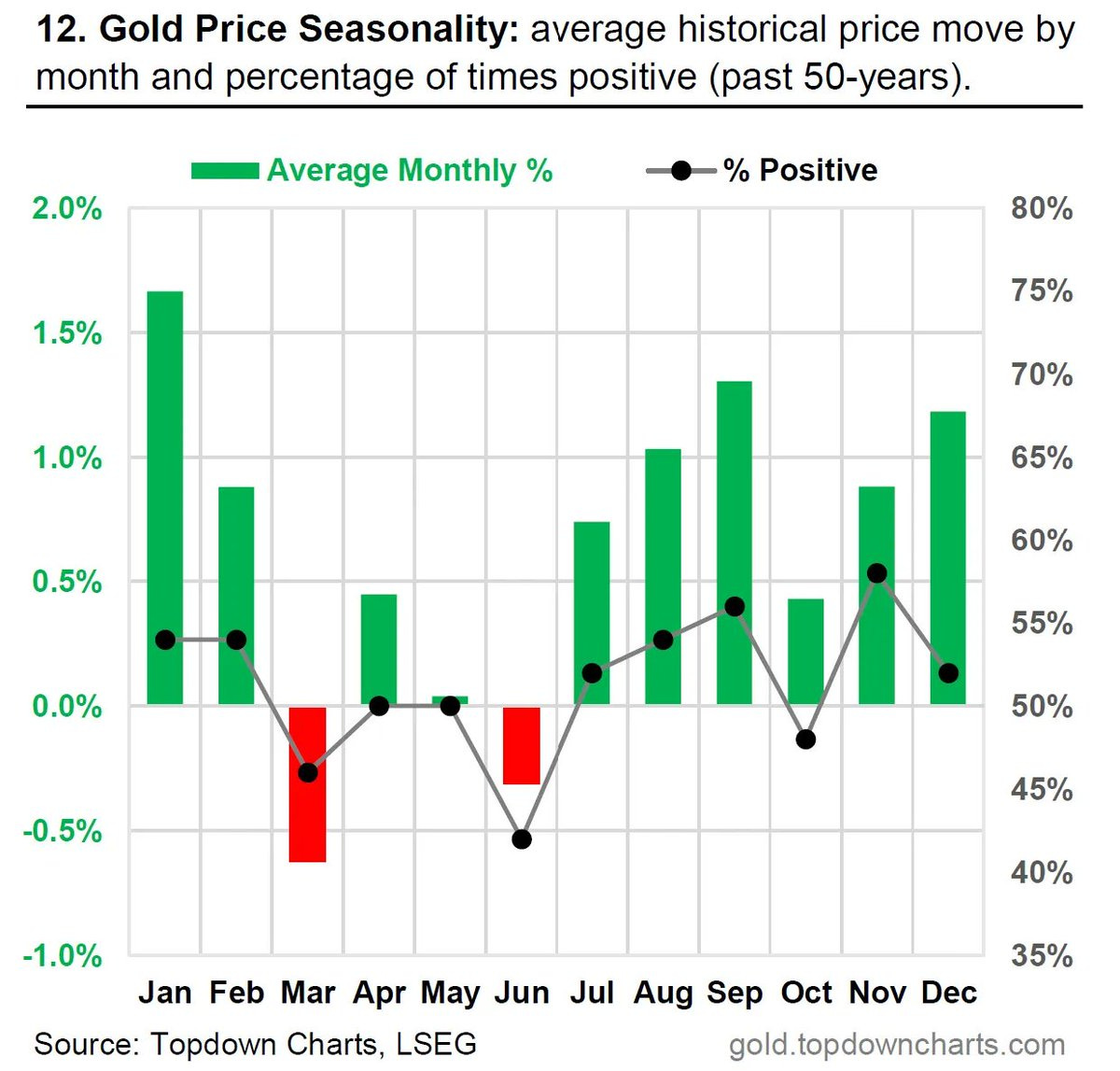 Upside inflation surprises may frustrate the Fed, but it could be a huge catalyst for the next uptrend phase in gold prices. Following the PCE inflation report, gold is breaking out from a four month triangle consolidation pattern and is trading near the prior record high set back in April. That’s happening as gold’s historical seasonality is becoming more of a bullish tailwind as well. Over the past 50 years, September has been the second strongest month for gold returns as well as the percent of time gold finishes with a gain (chart below). Seasonality mostly remains a tailwind heading into early next year.