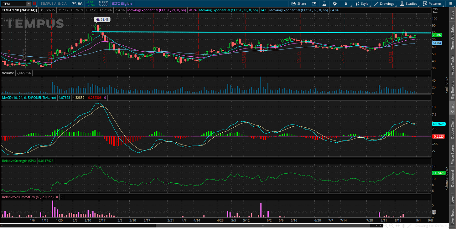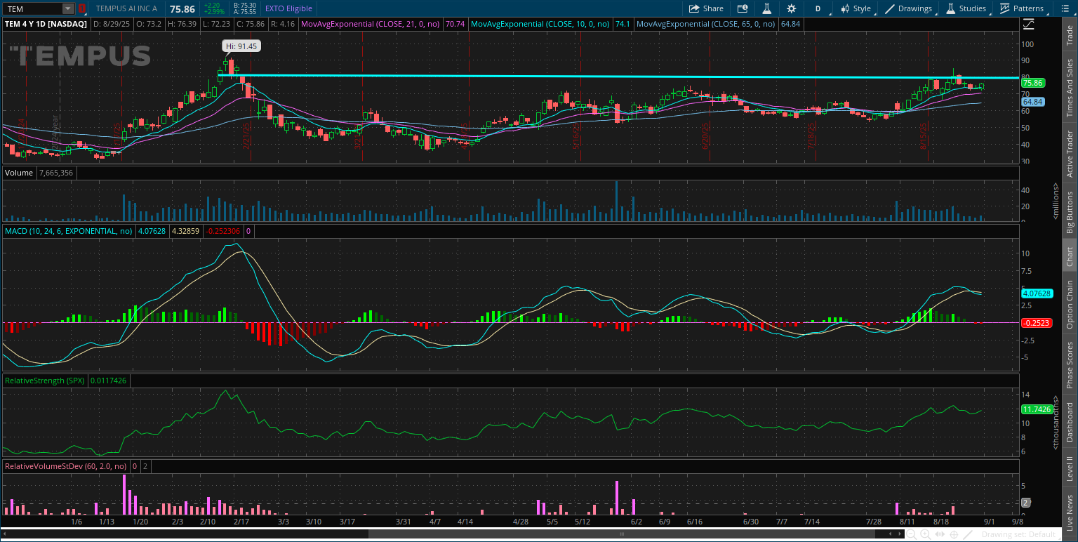 Recent AI healthcare IPO that’s trading in a narrowing range since March. Price is making a smaller pullback following a test of the $80 level, while we also need to see the MACD reset at zero. I’m watching for a move over $80 followed by new highs.
